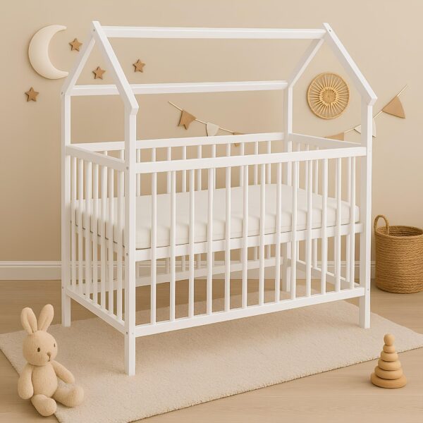 Dieses umwandelbare Babybett im skandinavischen Stil ist die ideale Kombination aus Sicherheit, Langlebigkeit und kindgerechtem Design. Ob als klassisches Babybett oder dekoriertes Hausbett mit Dach – es schafft einen Wohlfühlort, an dem sich Ihr Kind geborgen fühlt und süße Träume erlebt.