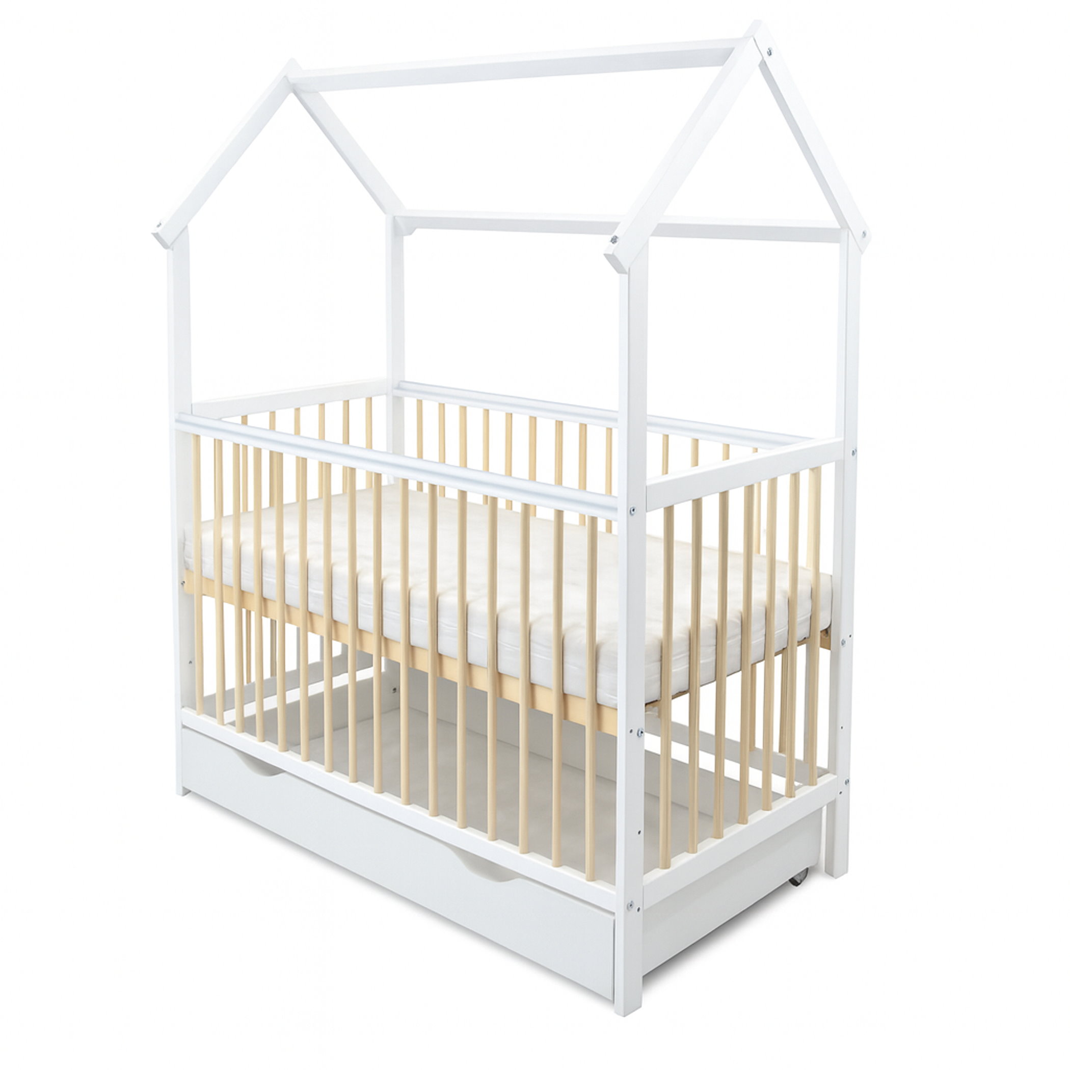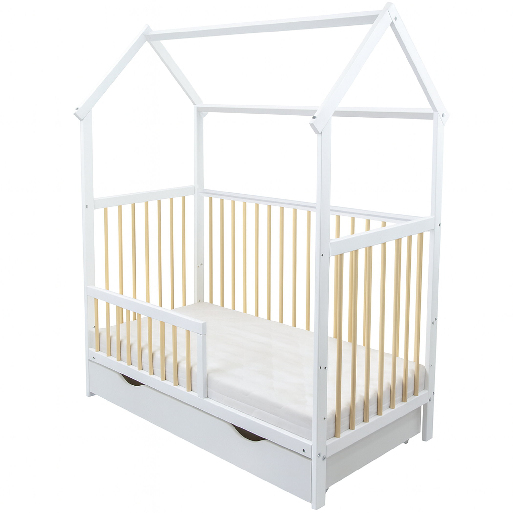 Baby Hausbett 60×120 cm mit Schublade – aus Kiefer Massivholz, Weiß Kiefer