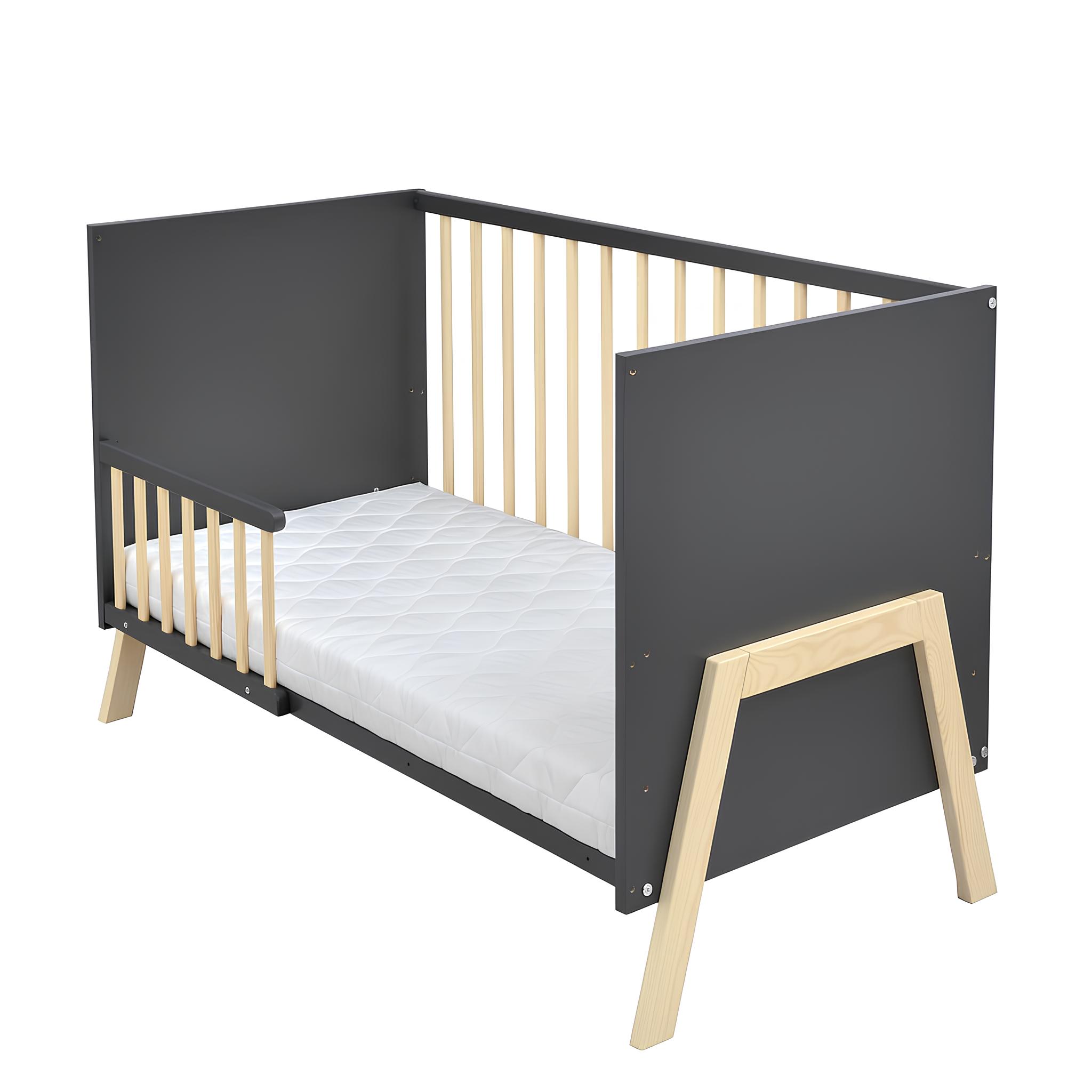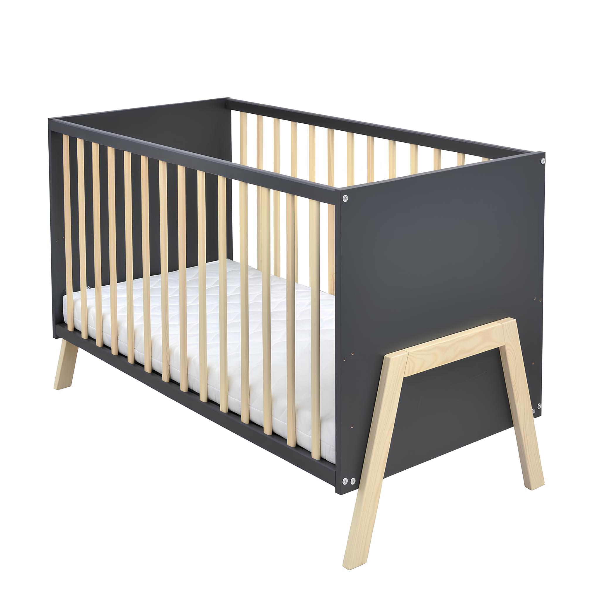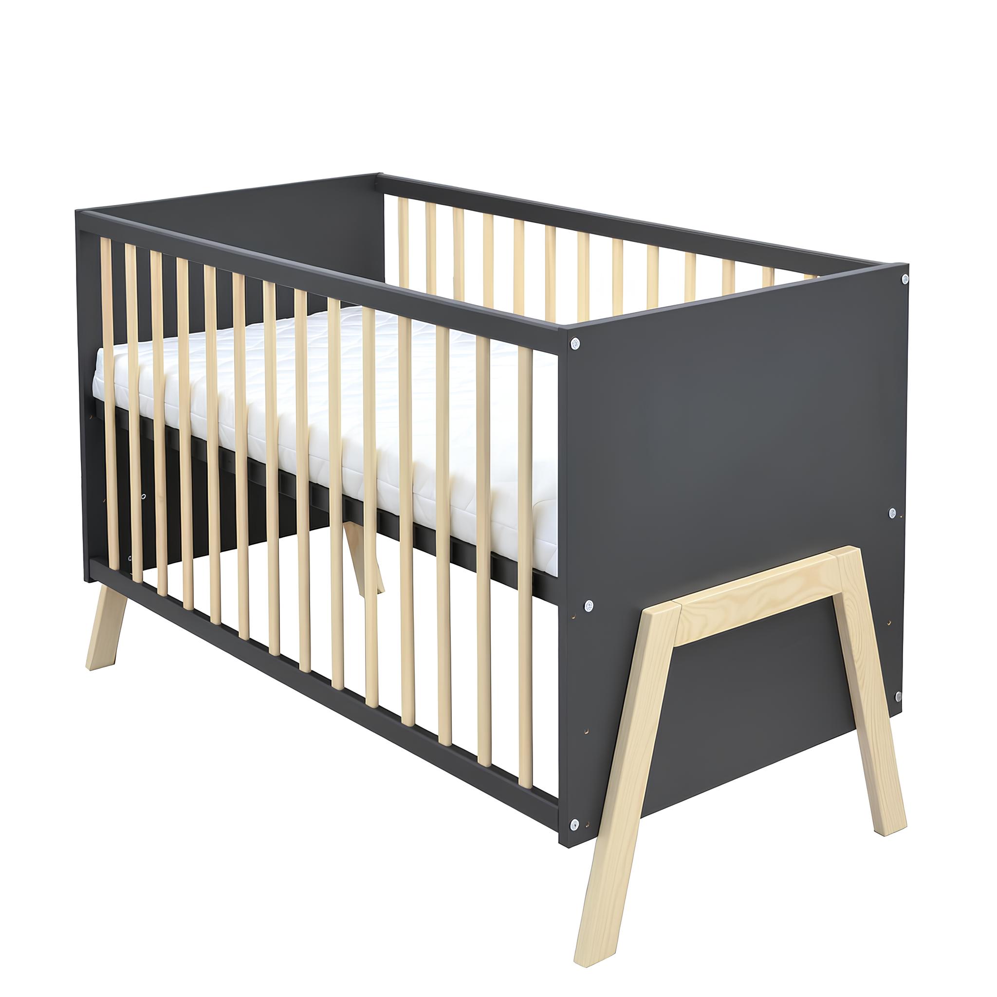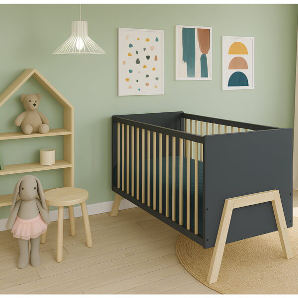 Das Babybett Juna ist die perfekte Wahl für Eltern, die Wert auf Sicherheit, Qualität und modernes Design legen. Gefertigt aus robustem Kiefer-Massivholz überzeugt es durch seine langlebige Verarbeitung und den zeitlosen Look in Grau mit natürlichen Holzelementen. Mit einem Innenmaß von 60×120 cm bietet es die ideale Größe für erholsamen Babyschlaf und fügt sich harmonisch in jedes Kinderzimmer ein.