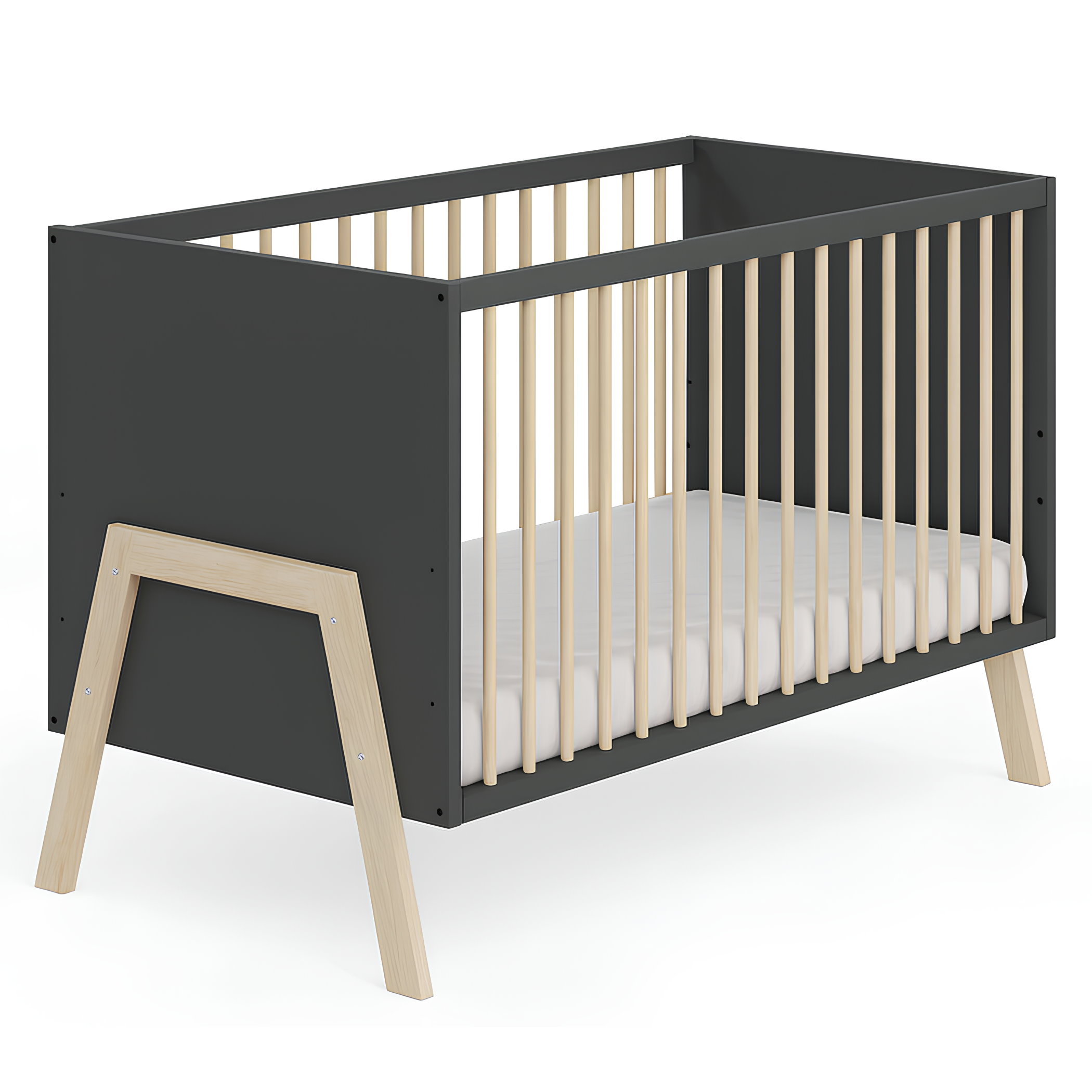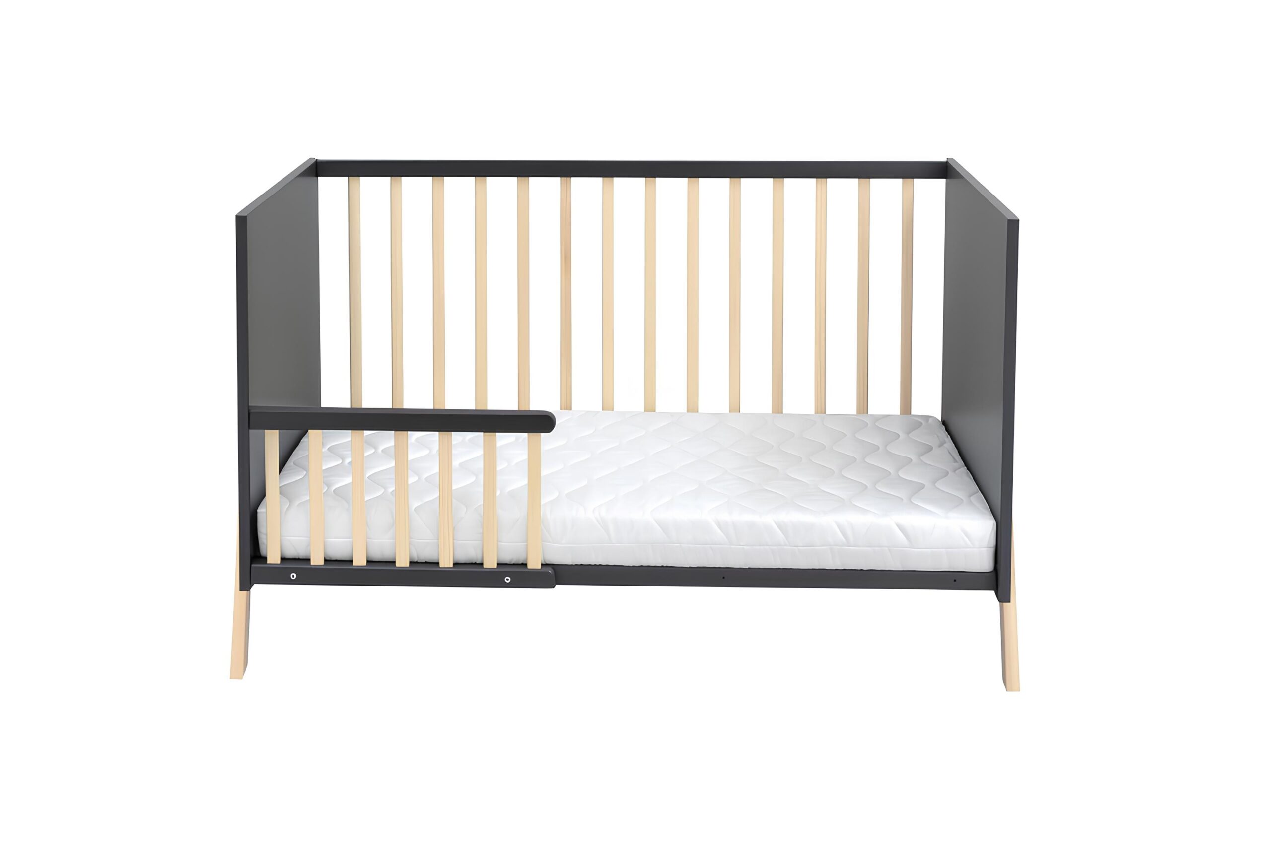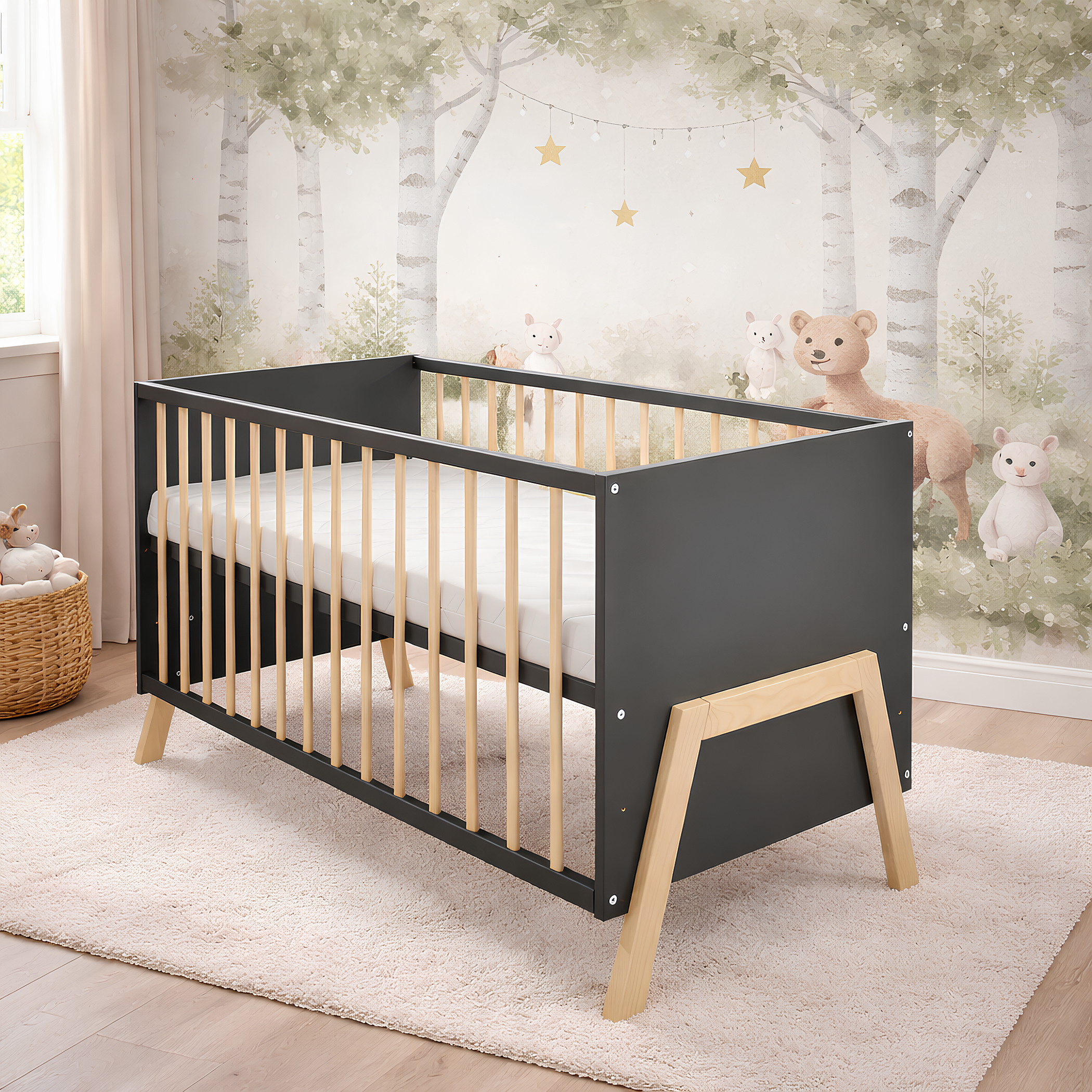 Das Babybett Juna ist die perfekte Wahl für Eltern, die Wert auf Sicherheit, Qualität und modernes Design legen. Gefertigt aus robustem Kiefer-Massivholz überzeugt es durch seine langlebige Verarbeitung und den zeitlosen Look in Grau mit natürlichen Holzelementen. Mit einem Innenmaß von 60×120 cm bietet es die ideale Größe für erholsamen Babyschlaf und fügt sich harmonisch in jedes Kinderzimmer ein.