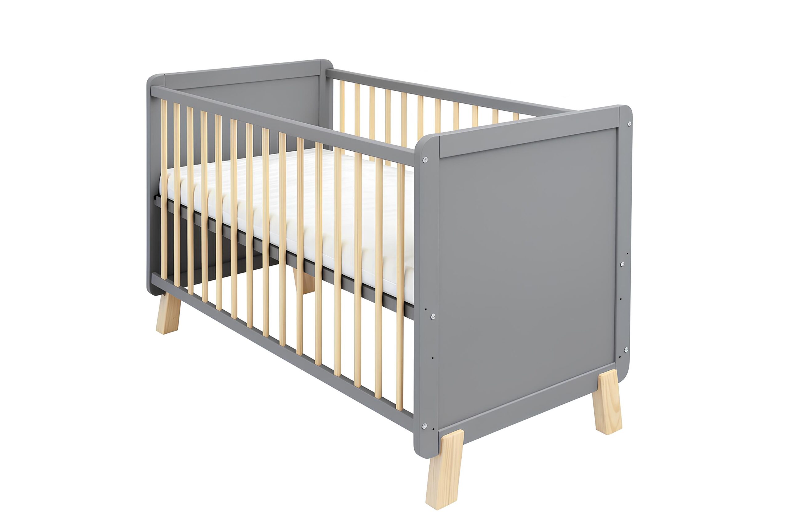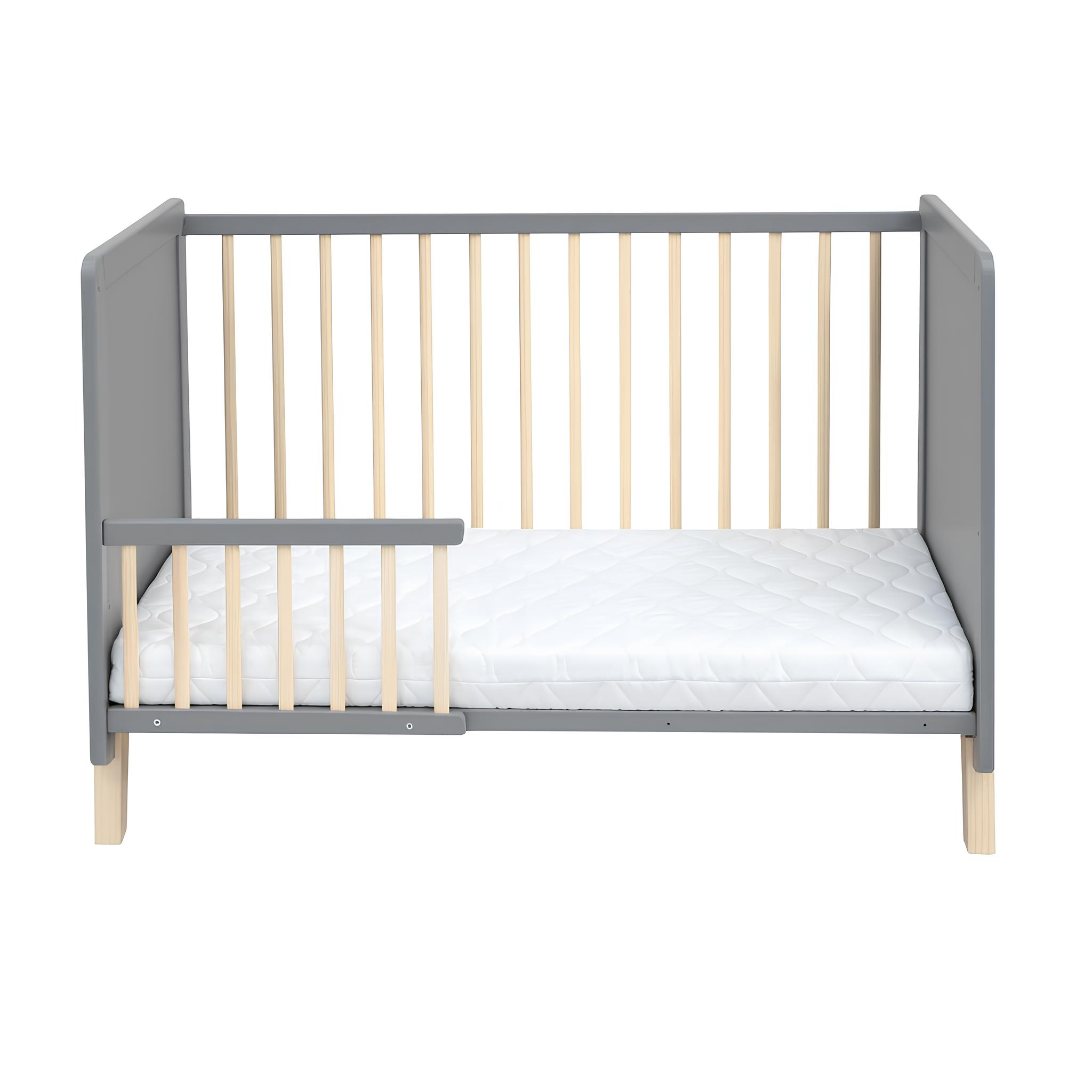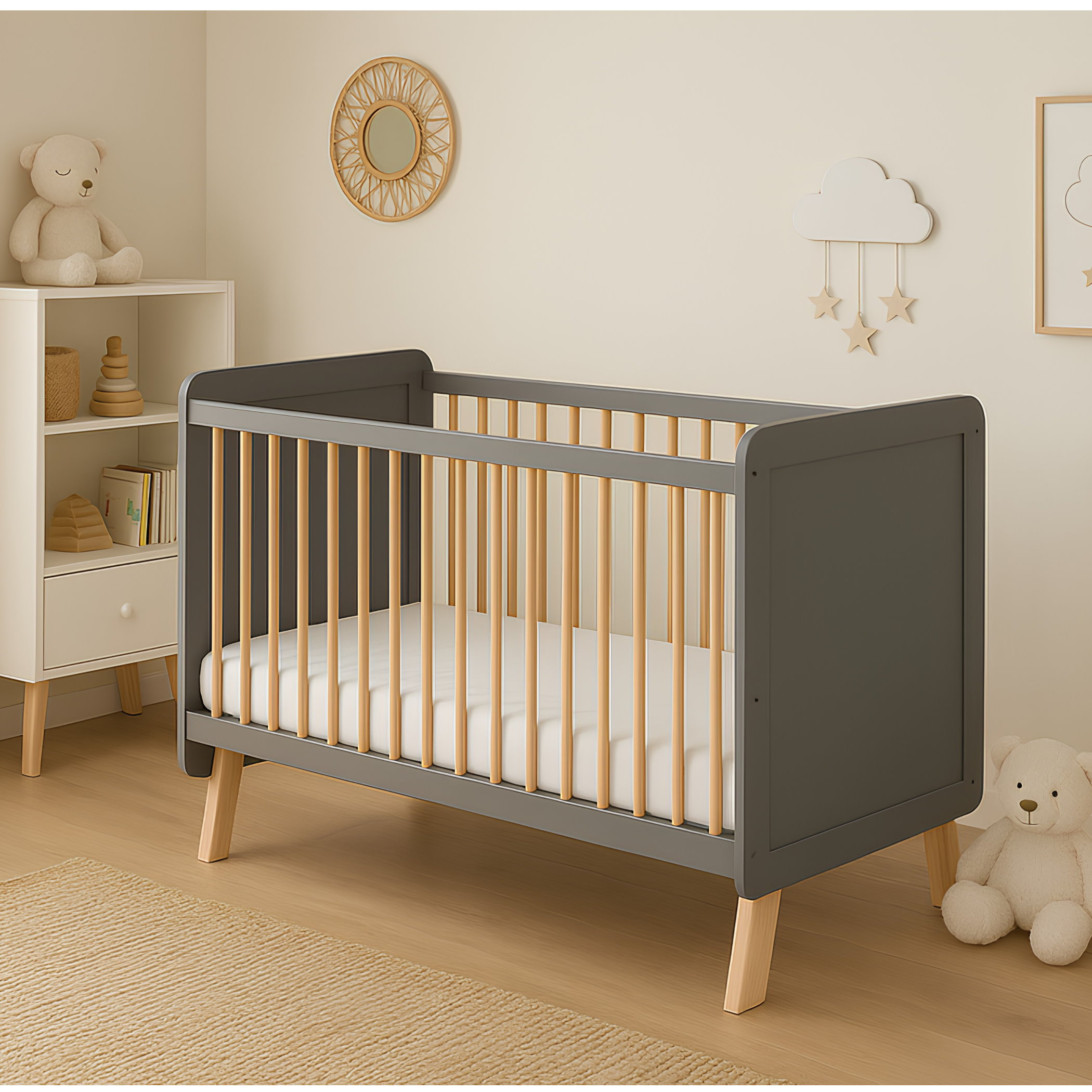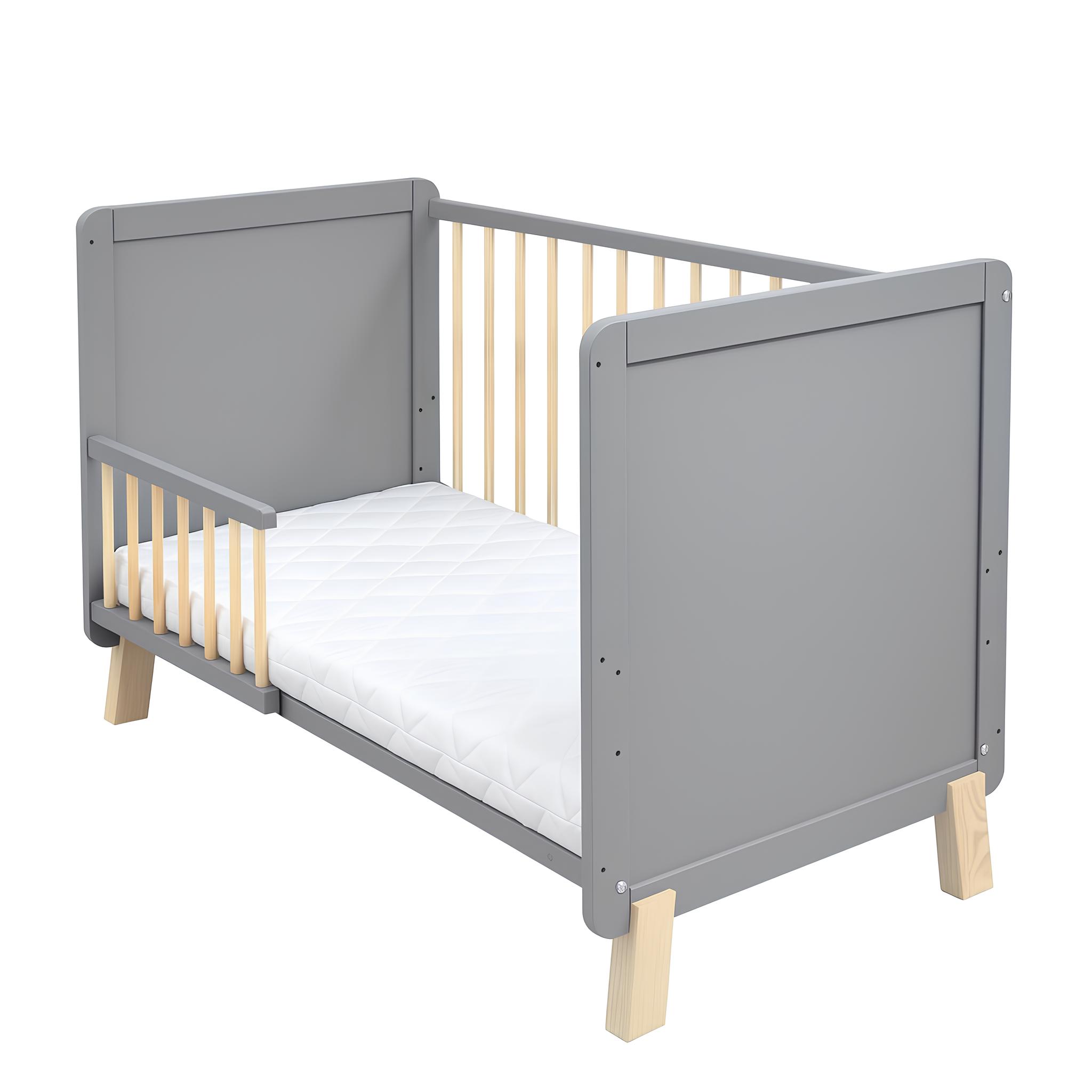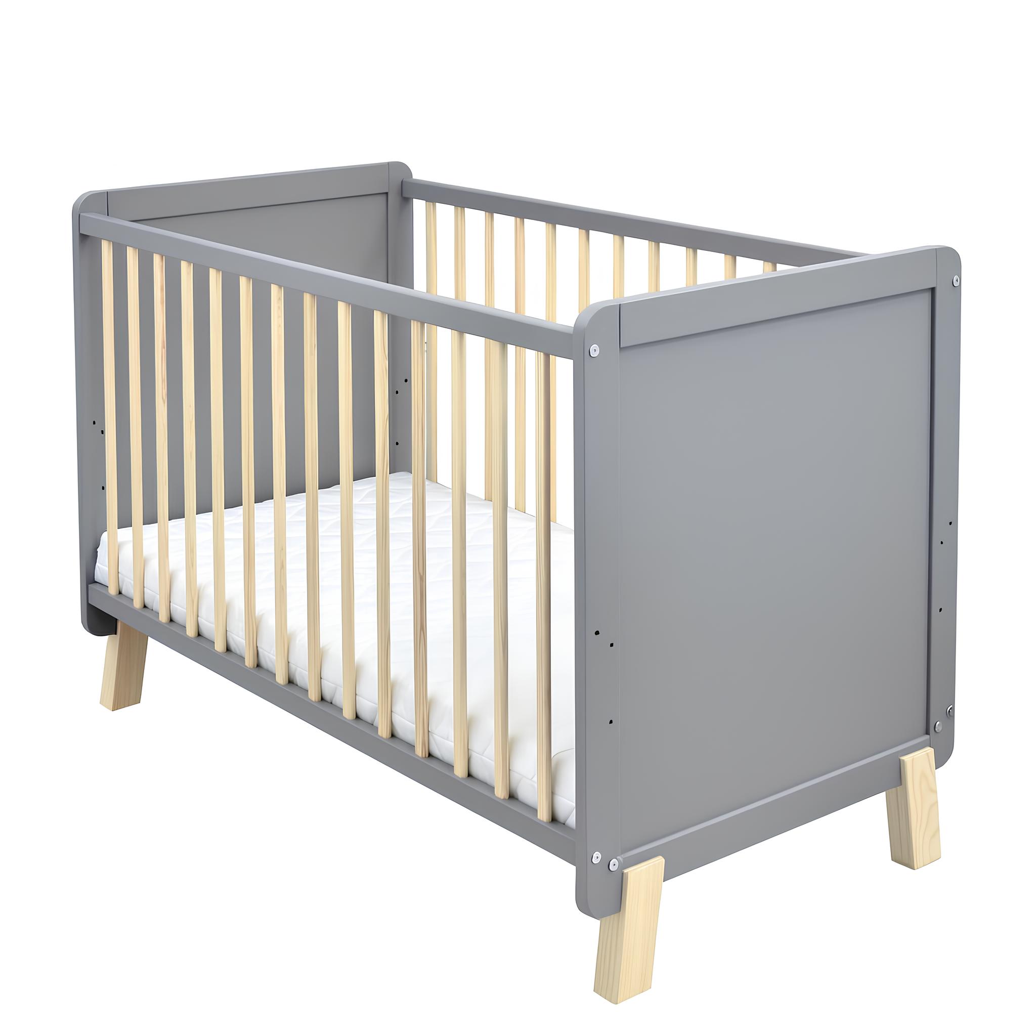 Das Babybett Lou ist die perfekte Wahl für Eltern, die Wert auf Sicherheit, Qualität und modernes Design legen. Gefertigt aus robustem Kiefer-Massivholz überzeugt es durch seine langlebige Verarbeitung und den zeitlosen Look in Grau mit natürlichen Holzelementen. Mit einem Innenmaß von 60×120 cm bietet es die ideale Größe für erholsamen Babyschlaf und fügt sich harmonisch in jedes Kinderzimmer ein.