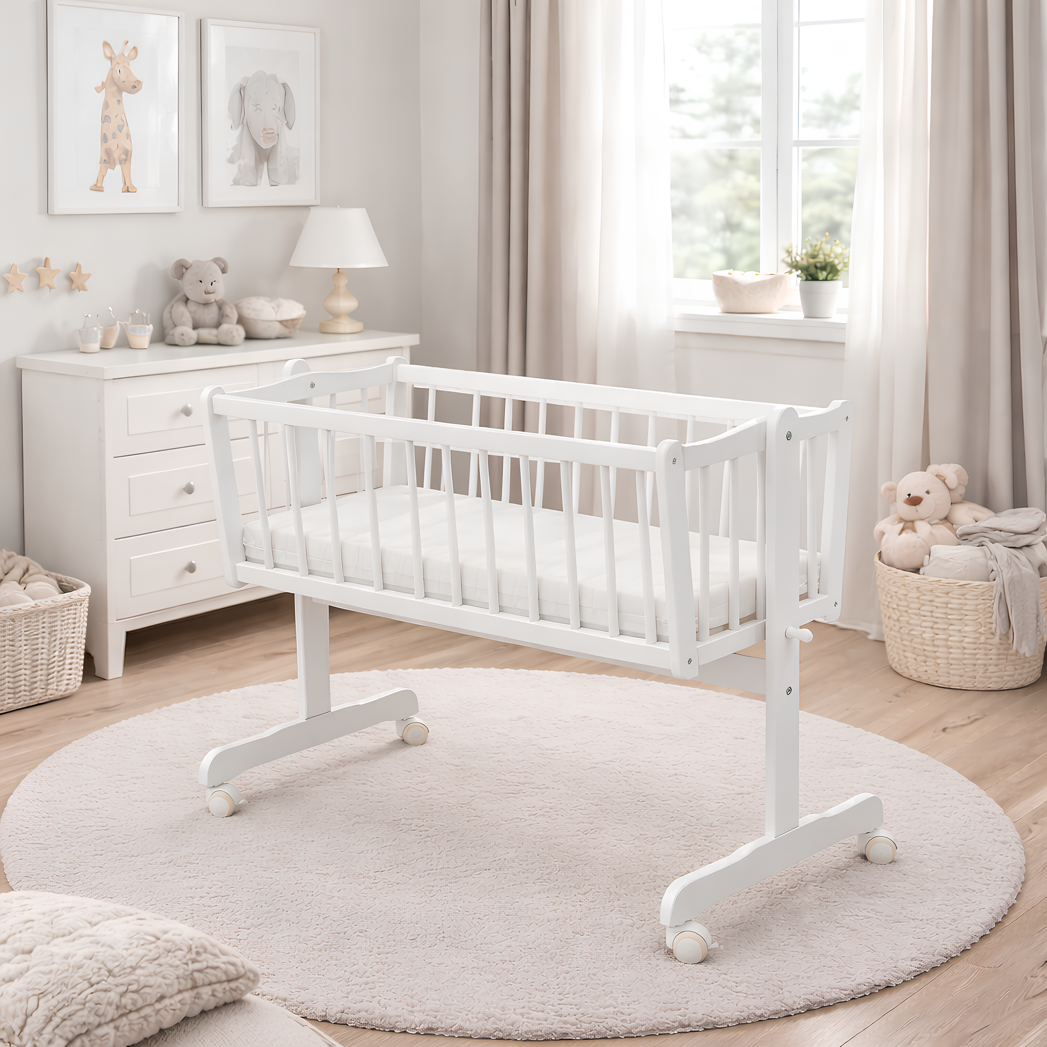 Babywiege weiß Schaukelwiege mit Matratze Kiefer Massivholz