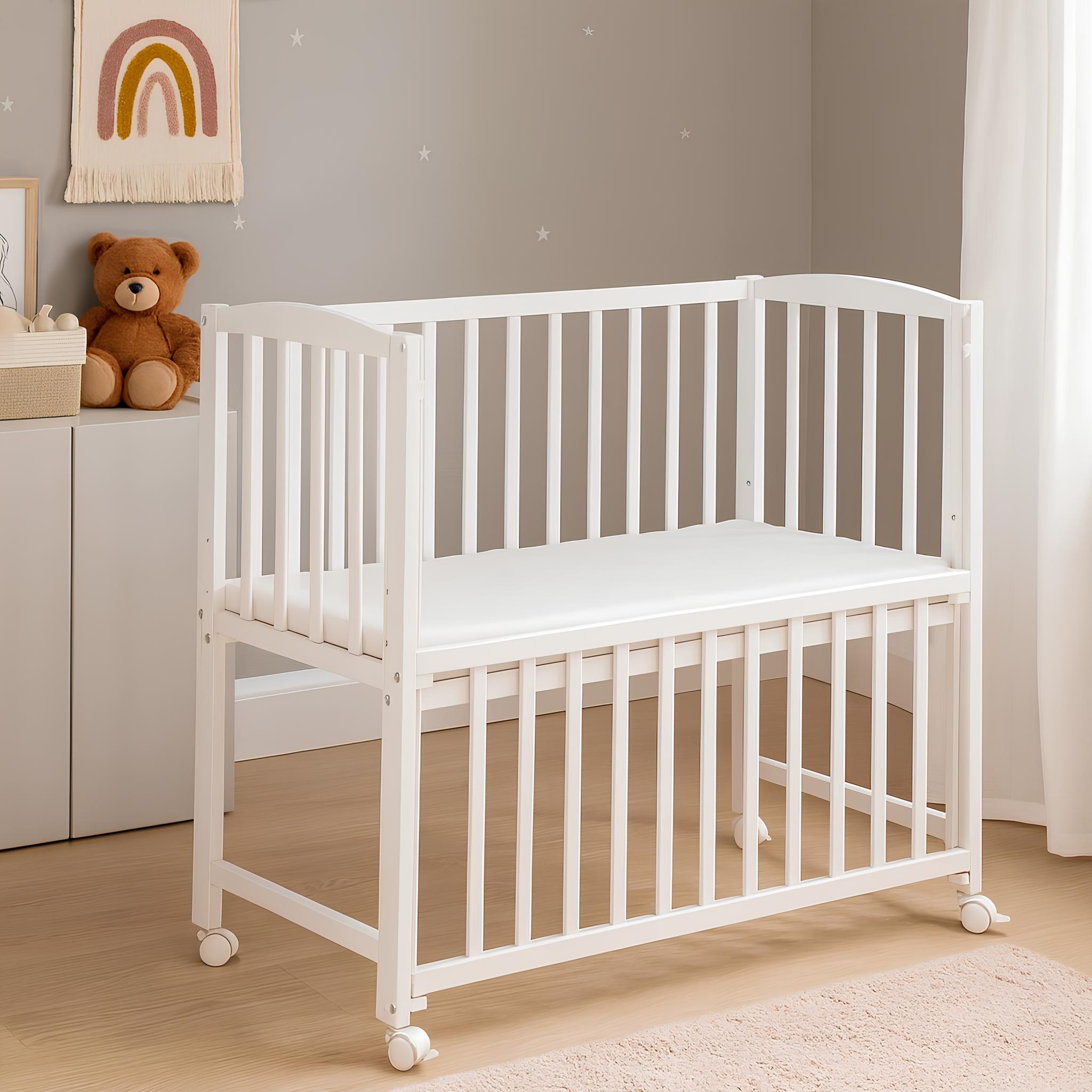 Unser Beistellbett aus massivem Kiefer Massivholz in strahlendem Weiß ist nicht nur ein praktisches Möbelstück, sondern auch ein sicherer und gemütlicher Schlafplatz für Ihr Baby. Entworfen für eine optimale Verbindung mit Ihrem Elternbett, bietet dieses Beistellbett eine höhenverstellbare Liegefläche und ein absenkbares Seitengitter, damit Ihr kleiner Liebling immer in Reichweite ist.