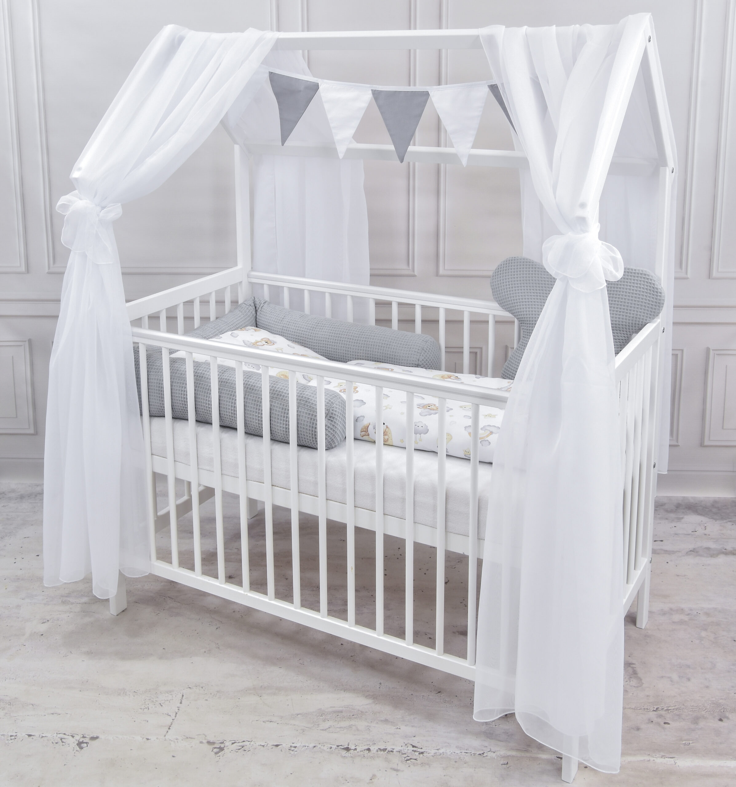 Ein besonderes Highlight ist das ergonomische Schmetterlingskissen aus Waffelpique, das den Kopf sanft stützt und gleichzeitig ein liebevolles Dekostück im Babybett ist. Abgerundet wird das Deko-Set durch eine dekorative Girlande aus 8 Dreiecken, die das Hausbett stilvoll schmückt und das Kinderzimmer mit einem verspielten Akzent verschönert.