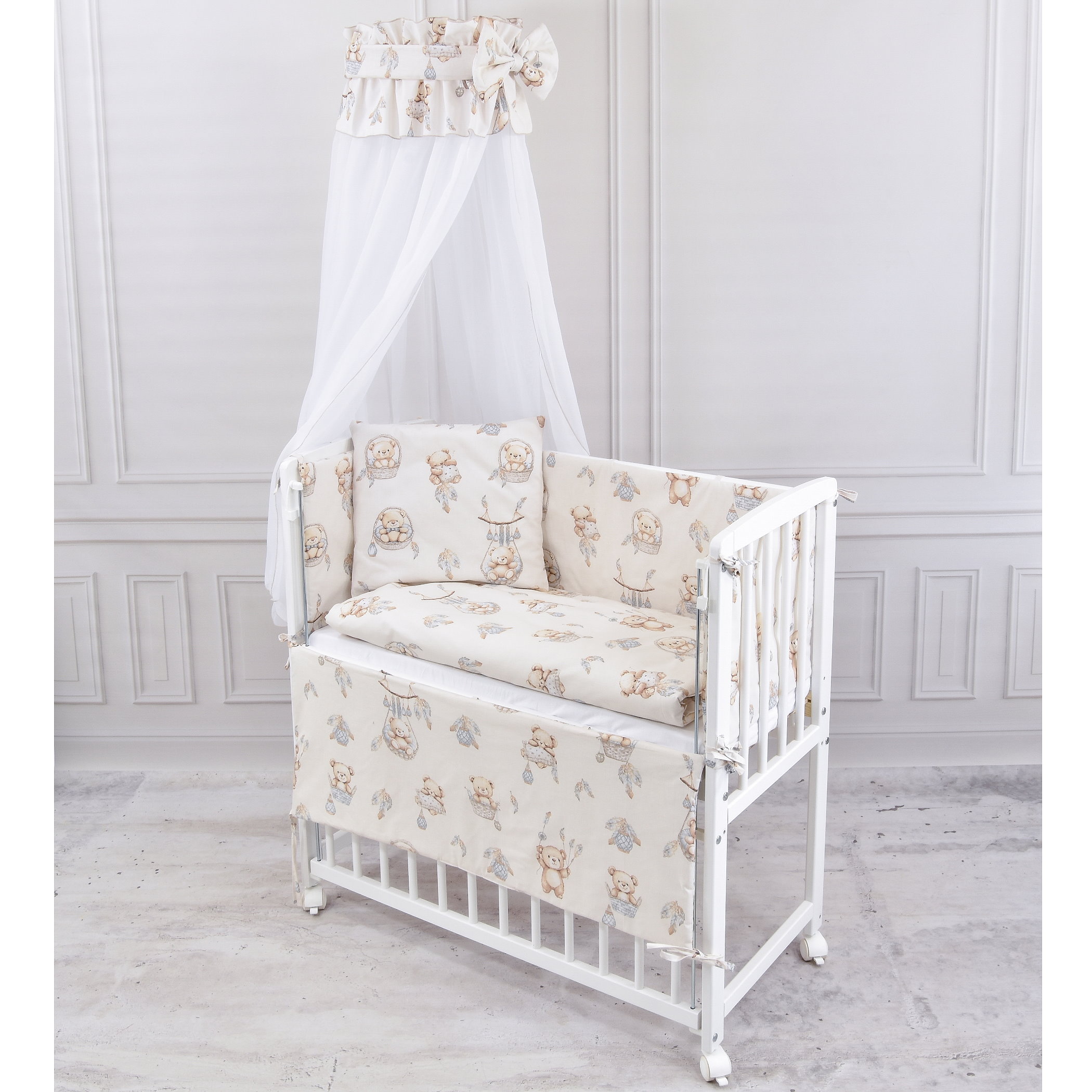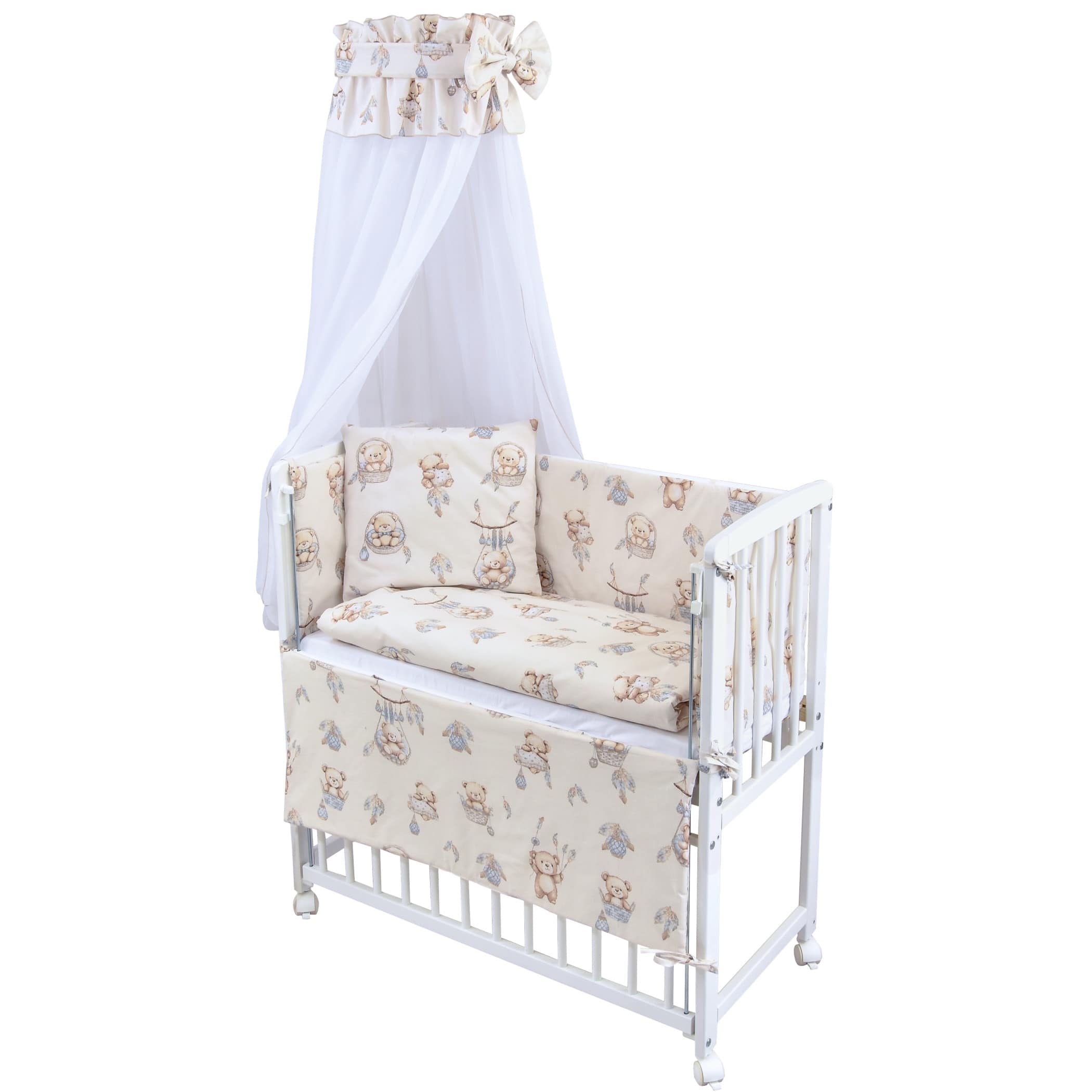 Das Set enthält eine Bettumrandung in zwei Teilen (260 cm x 30 cm), die das Beistellbett sanft auskleidet und für zusätzlichen Schutz sorgt. Der leichte Chiffonhimmel schafft eine gemütliche Atmosphäre und schützt Ihr Baby vor störenden Umwelteinflüssen. Die dekorative Schärpe mit Schleife verleihen dem Himmel eine bezaubernde Note.