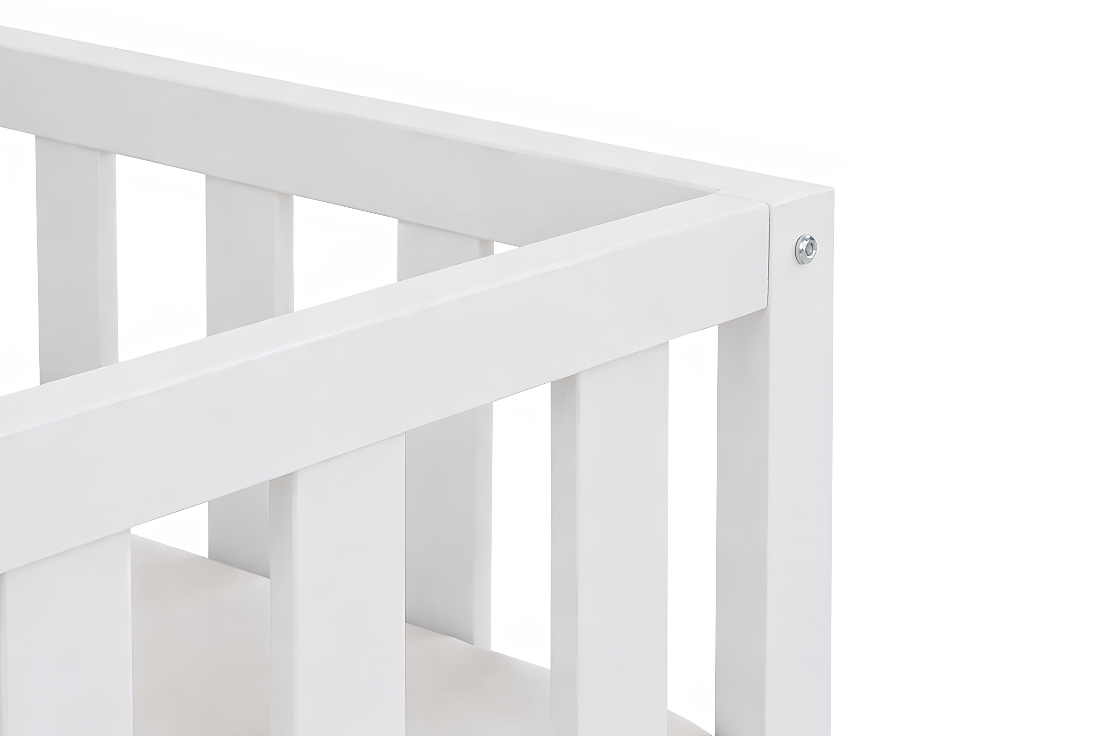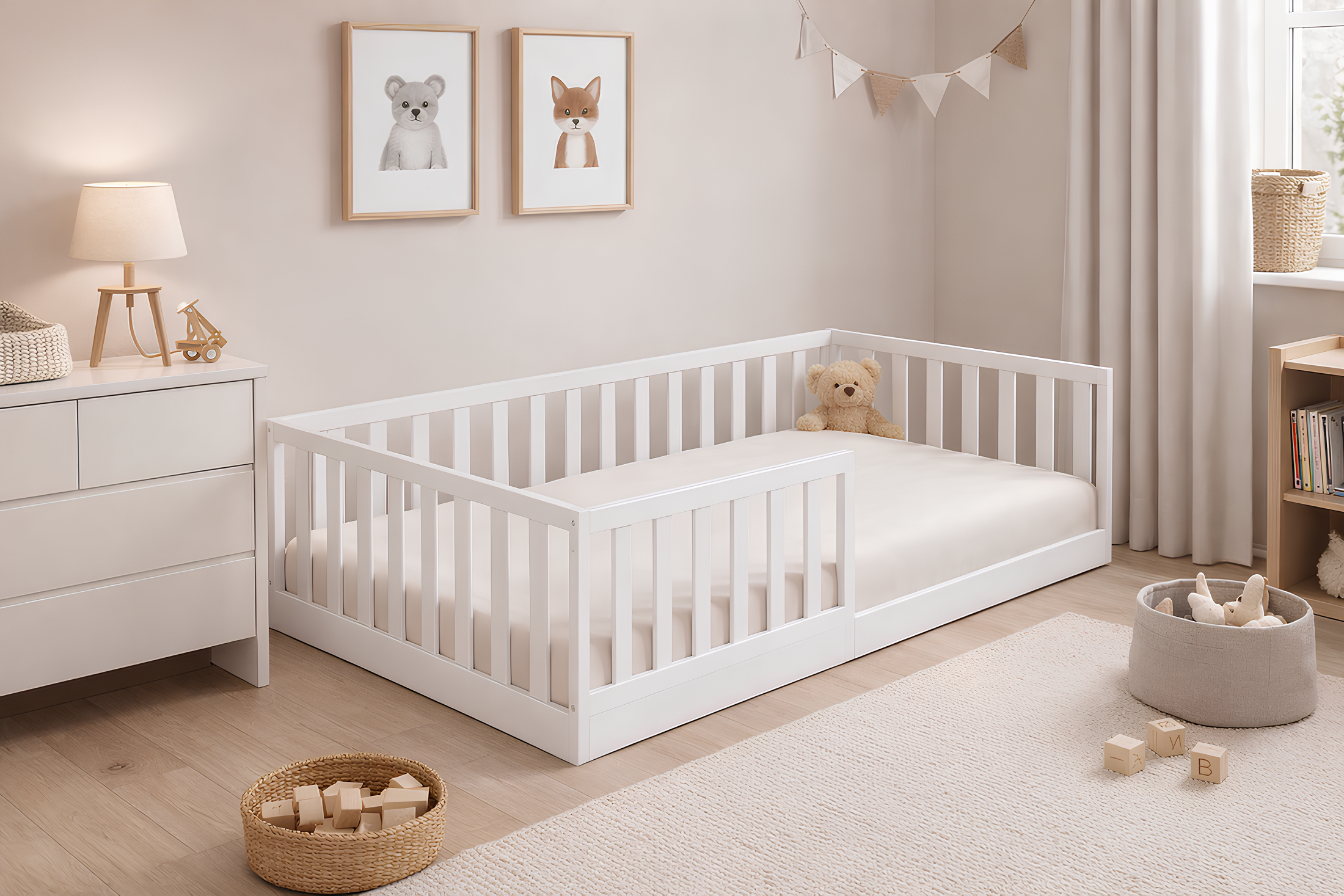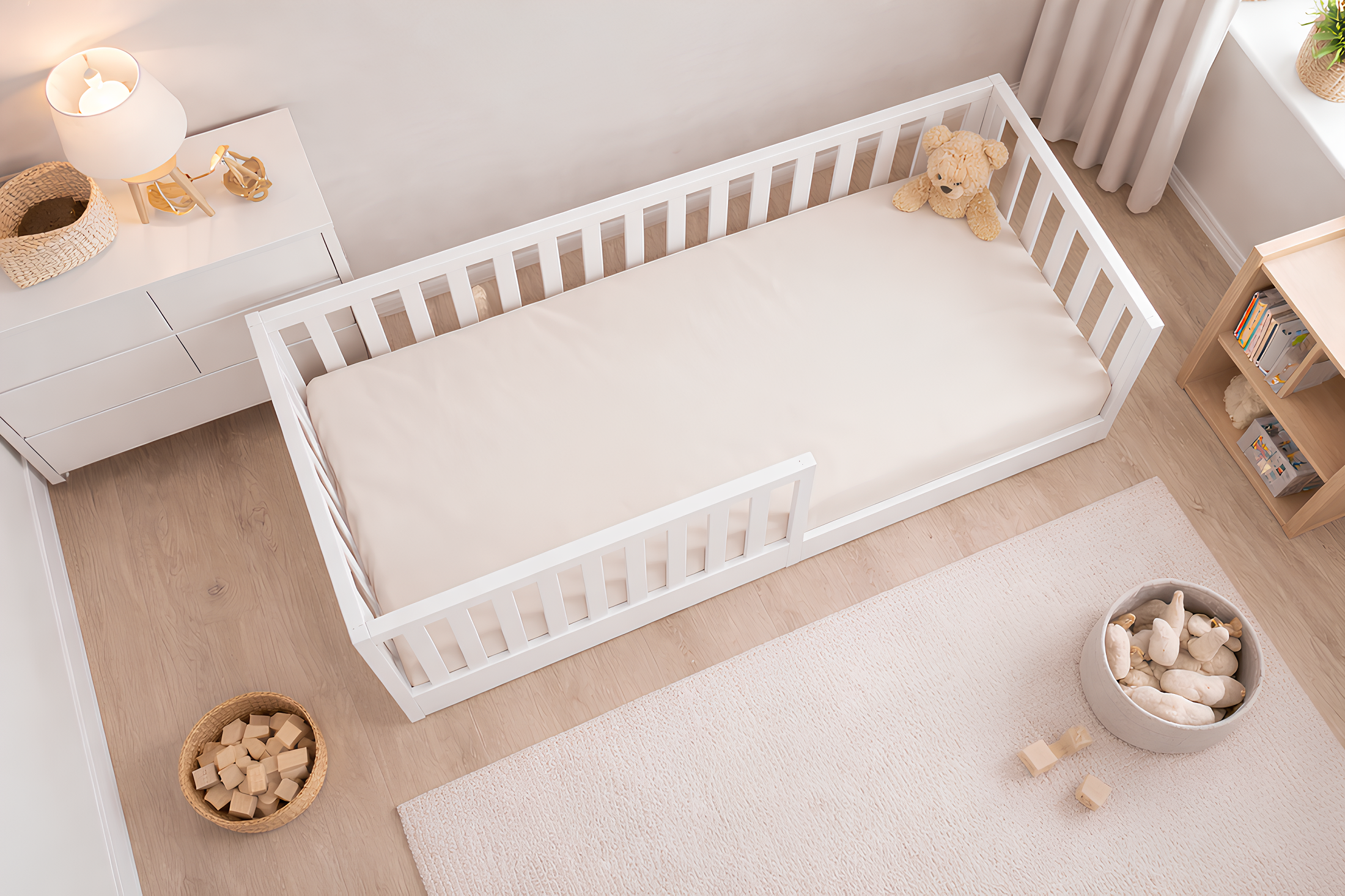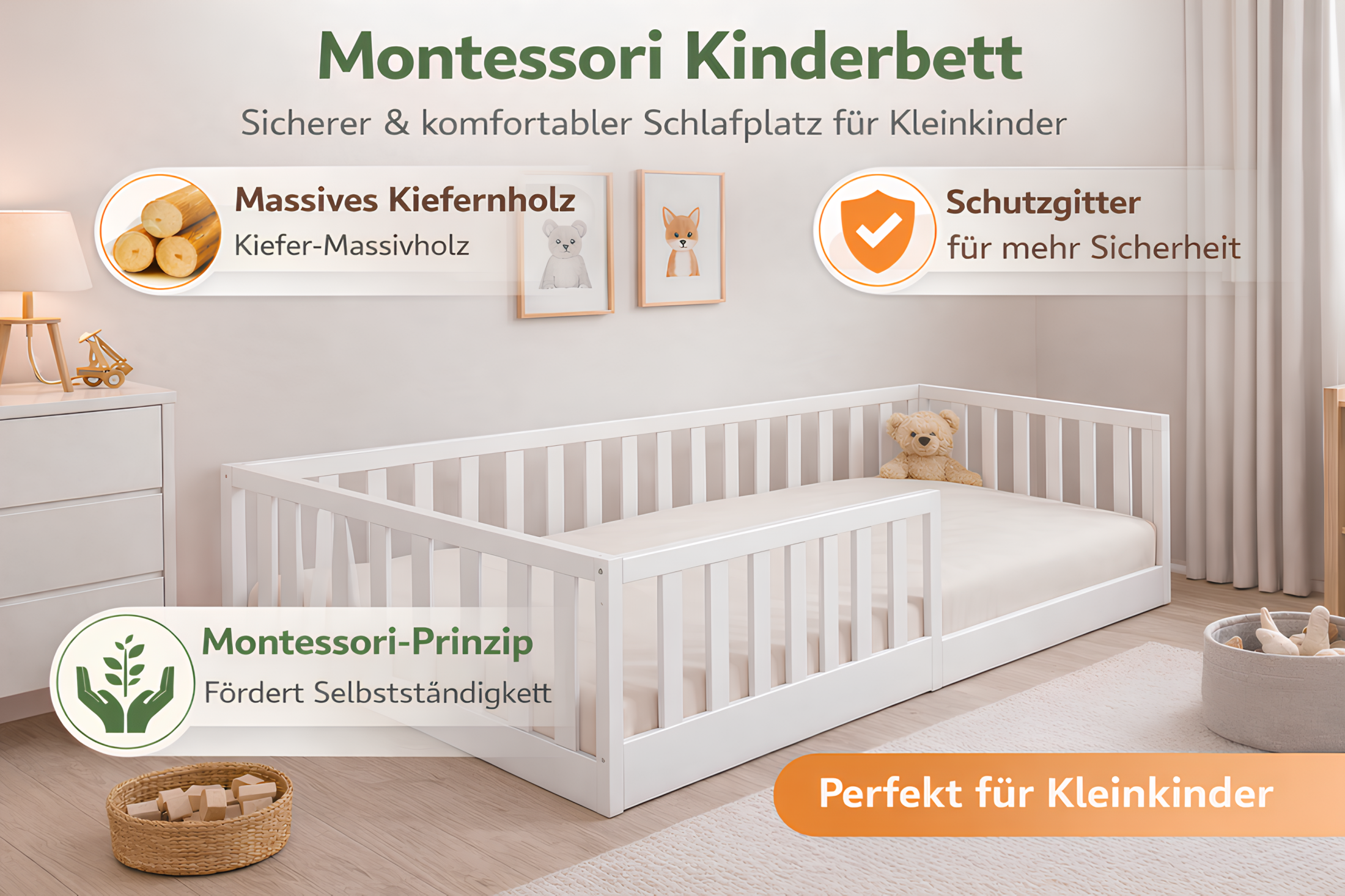 Montessori Bodenbett 90×200 cm – Kinderbett aus Kiefernholz mit Rausfallschutz in Weiß