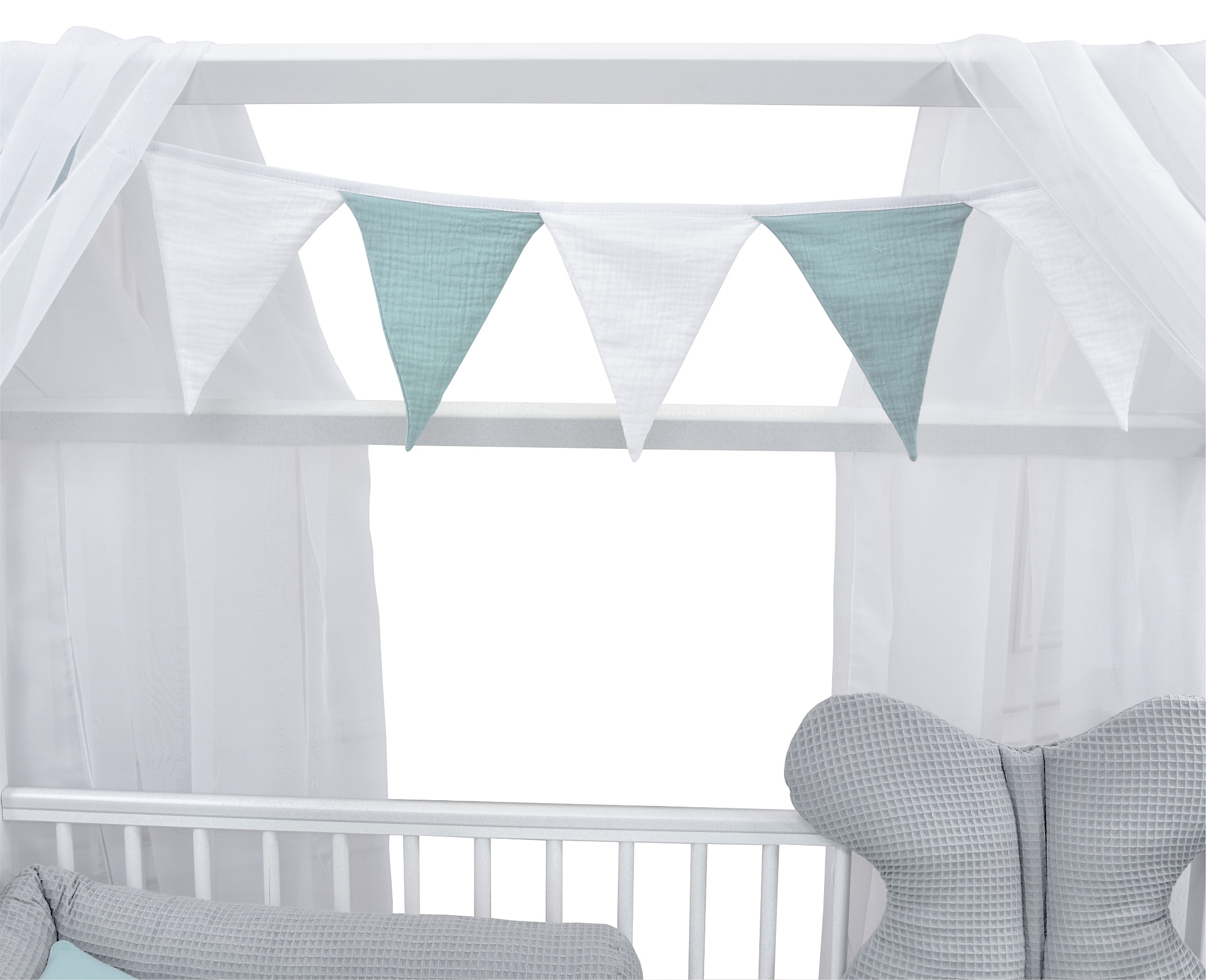 Die niedliche Girlande aus 8 Dreiecken rundet das Ambiente des Babyhausbettes perfekt ab.