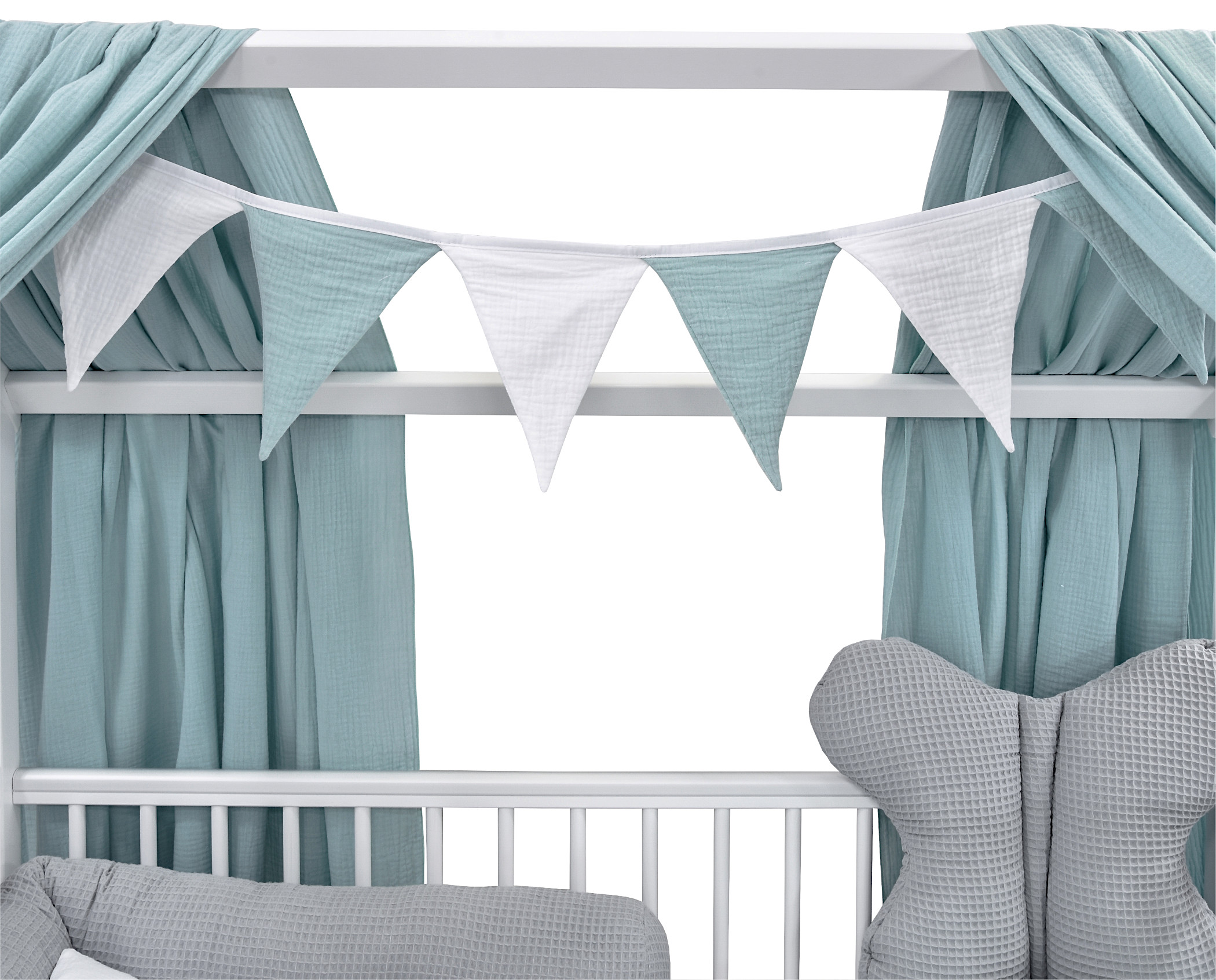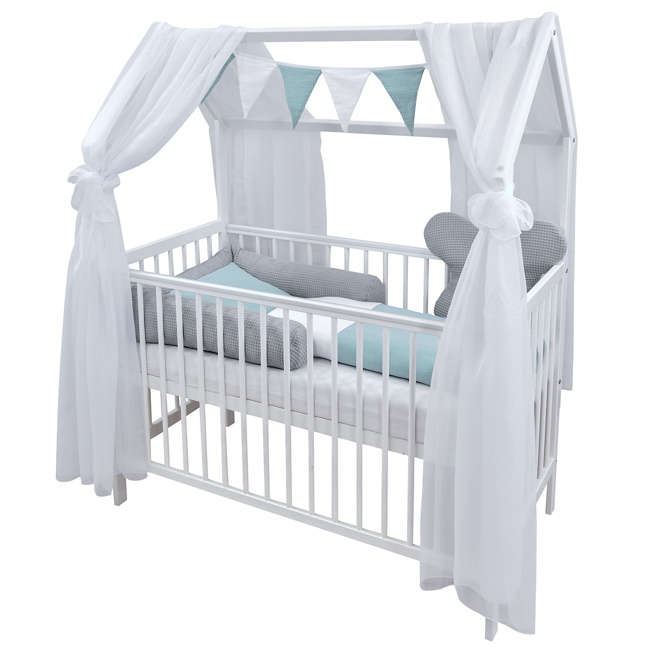 Komplettbett 2in1 Babybett Hausbett 120×60 cm Schutzgitter Schublade weiß dekoratives Bettwäsche Set grau mint Musselin Waffelpique