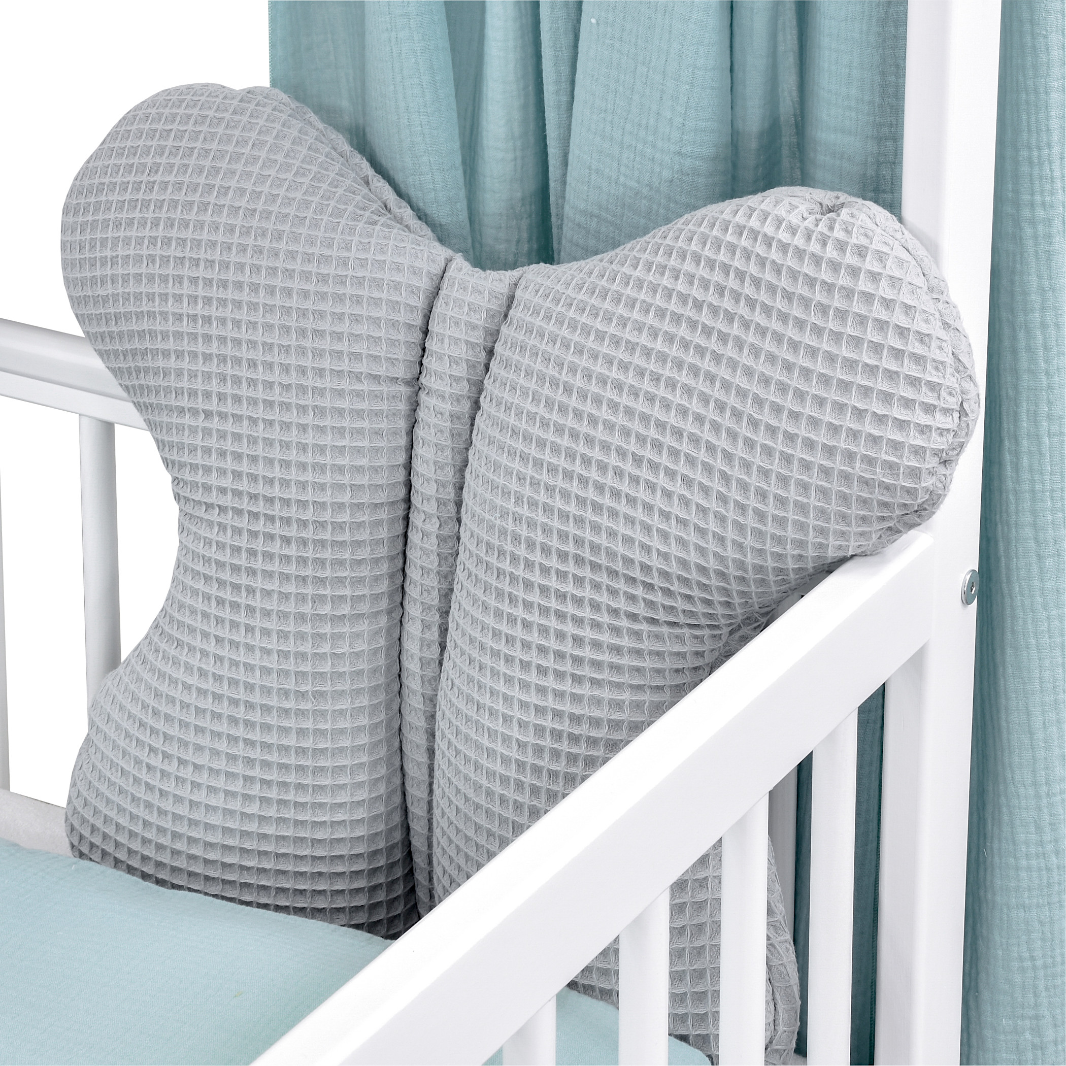 Das Bettset enthält auch einen Kissenbezug und Deckenbezug aus hochwertigem kuscheligen Musselin Stoff, sowie passendes Kissen und Decke. Für eine gemütliche Atmosphäre ist ein Schmetterlingskissen aus Waffelpique dabei, welches das Bett dekoriert.
