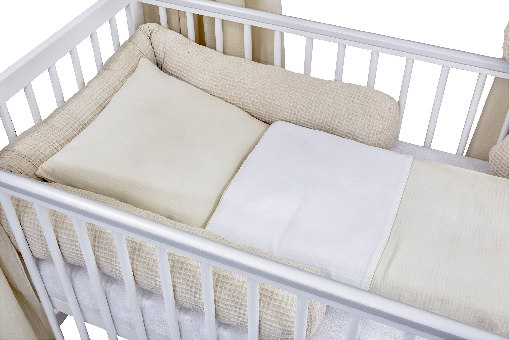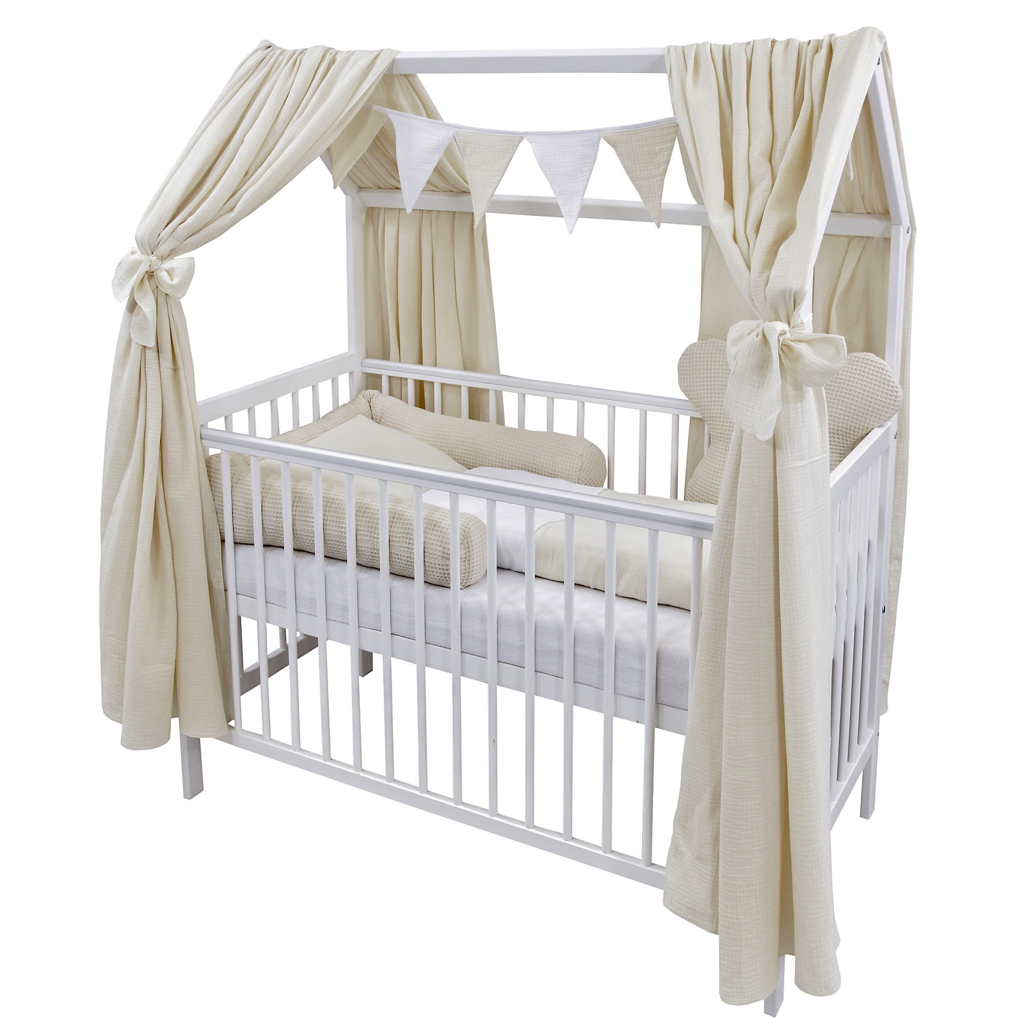 Komplettbett 2in1 Babybett Hausbett 120×60 cm Schutzgitter Schublade weiß dekoratives Bettwäsche Set hellbeige Musselin Waffelpique