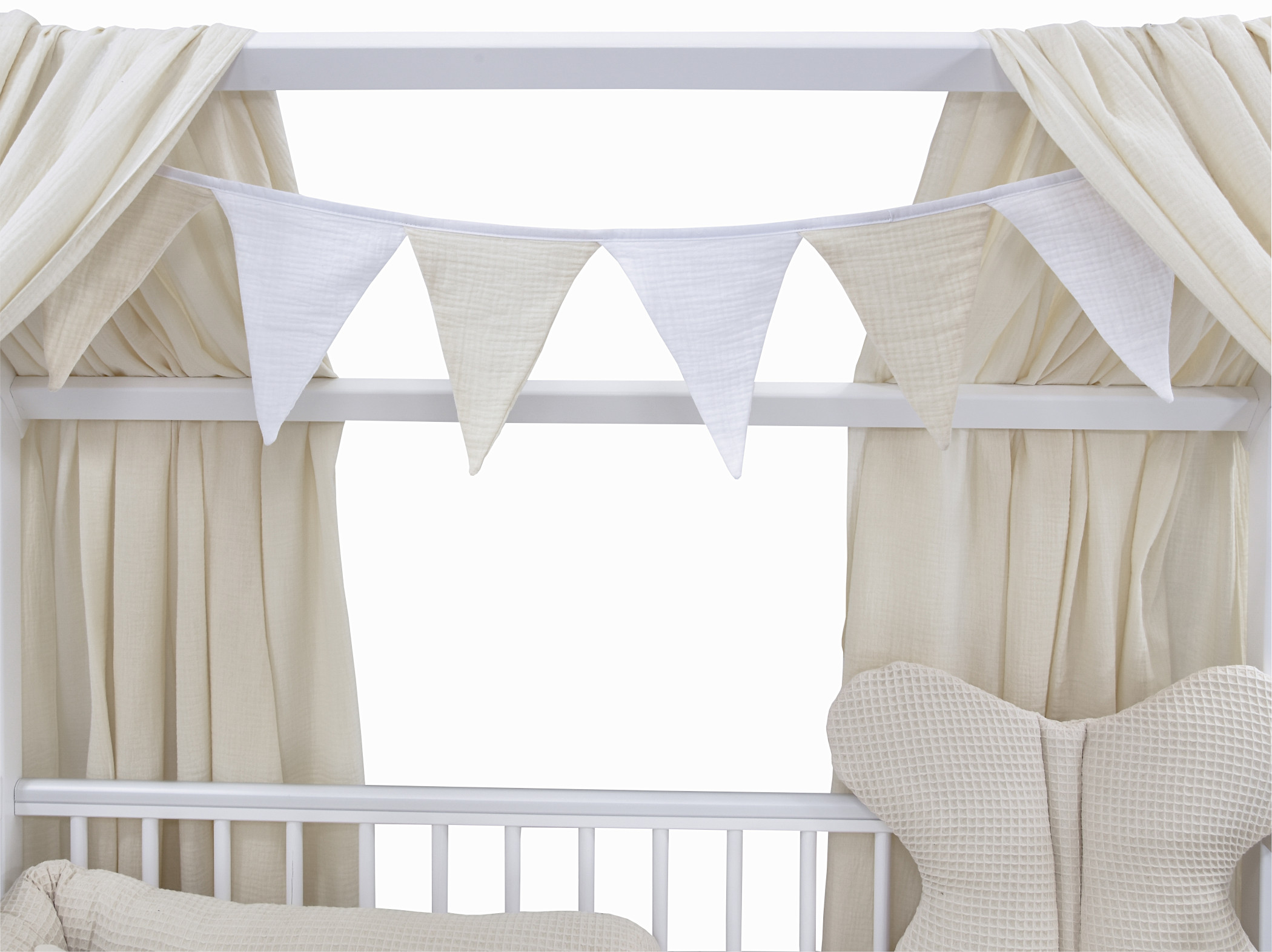 Die niedliche Girlande aus 8 Dreiecken rundet das Ambiente des Babyhausbettes perfekt ab.