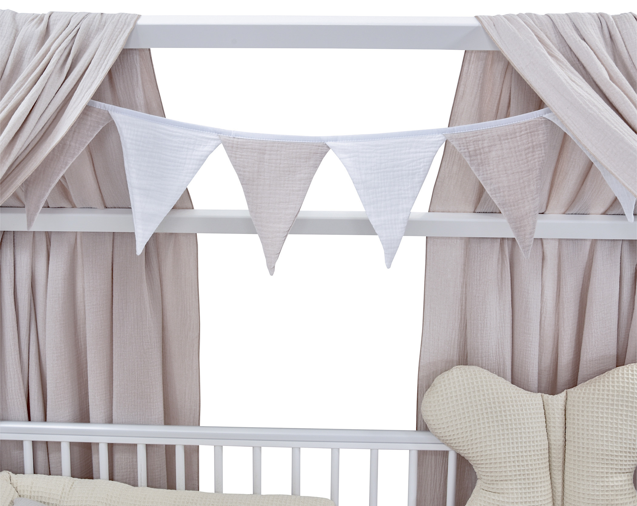 Die niedliche Girlande aus 8 Dreiecken rundet das Ambiente des Babyhausbettes perfekt ab.