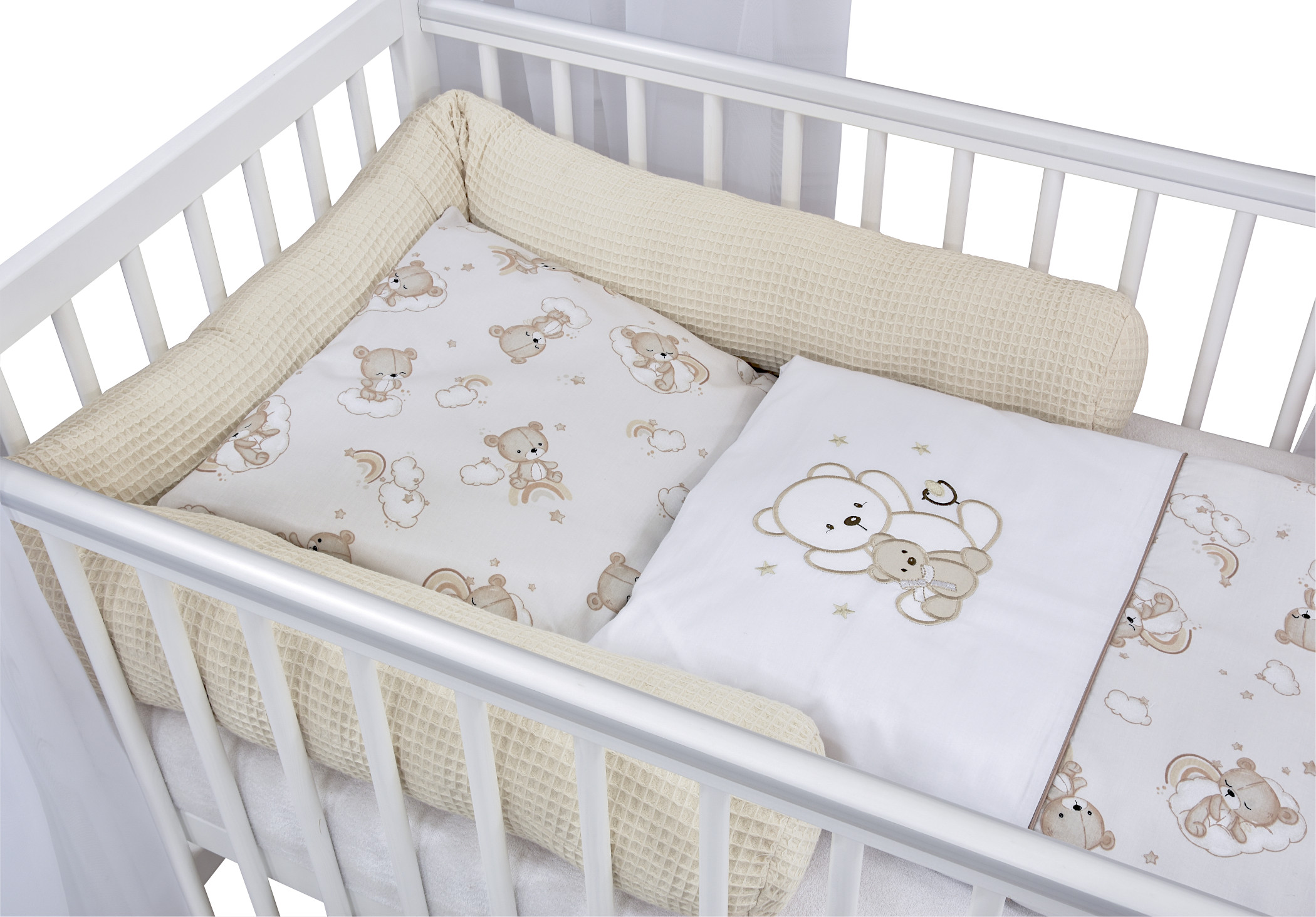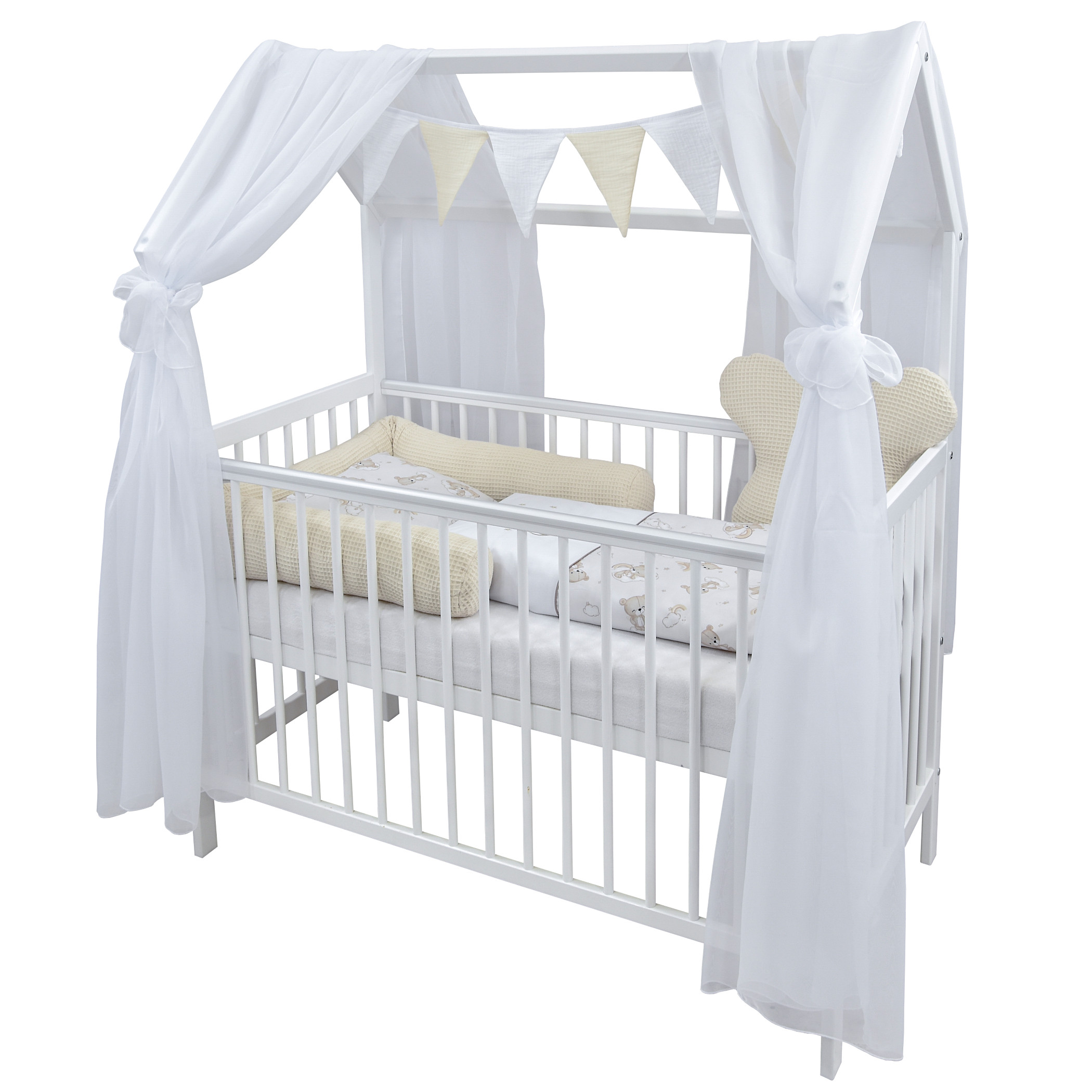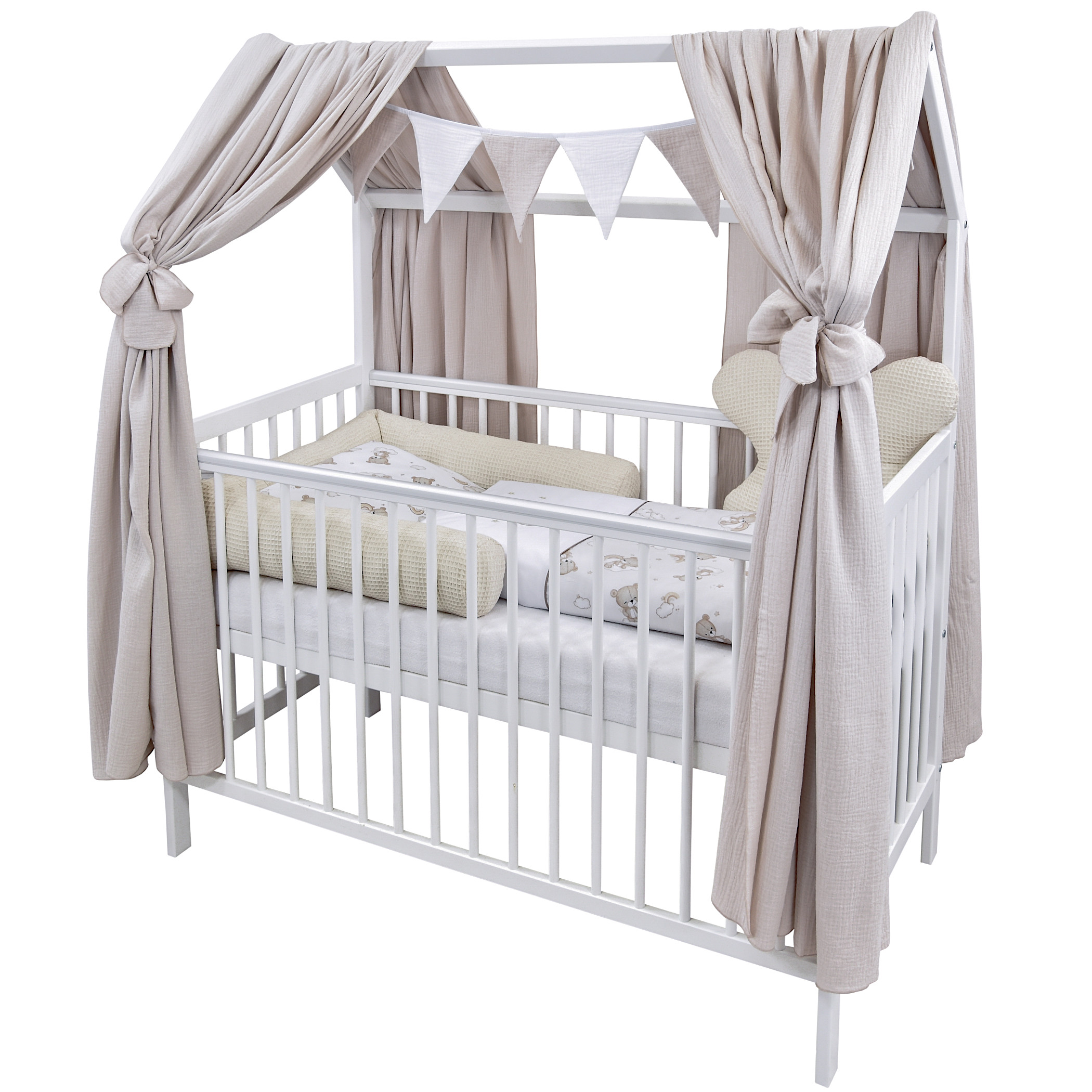 Komplettbett Babybett Hausbett 120×60 cm Schutzgitter Schublade weiß dekoratives Bettwäsche Set Bärchen beige Waffelpique