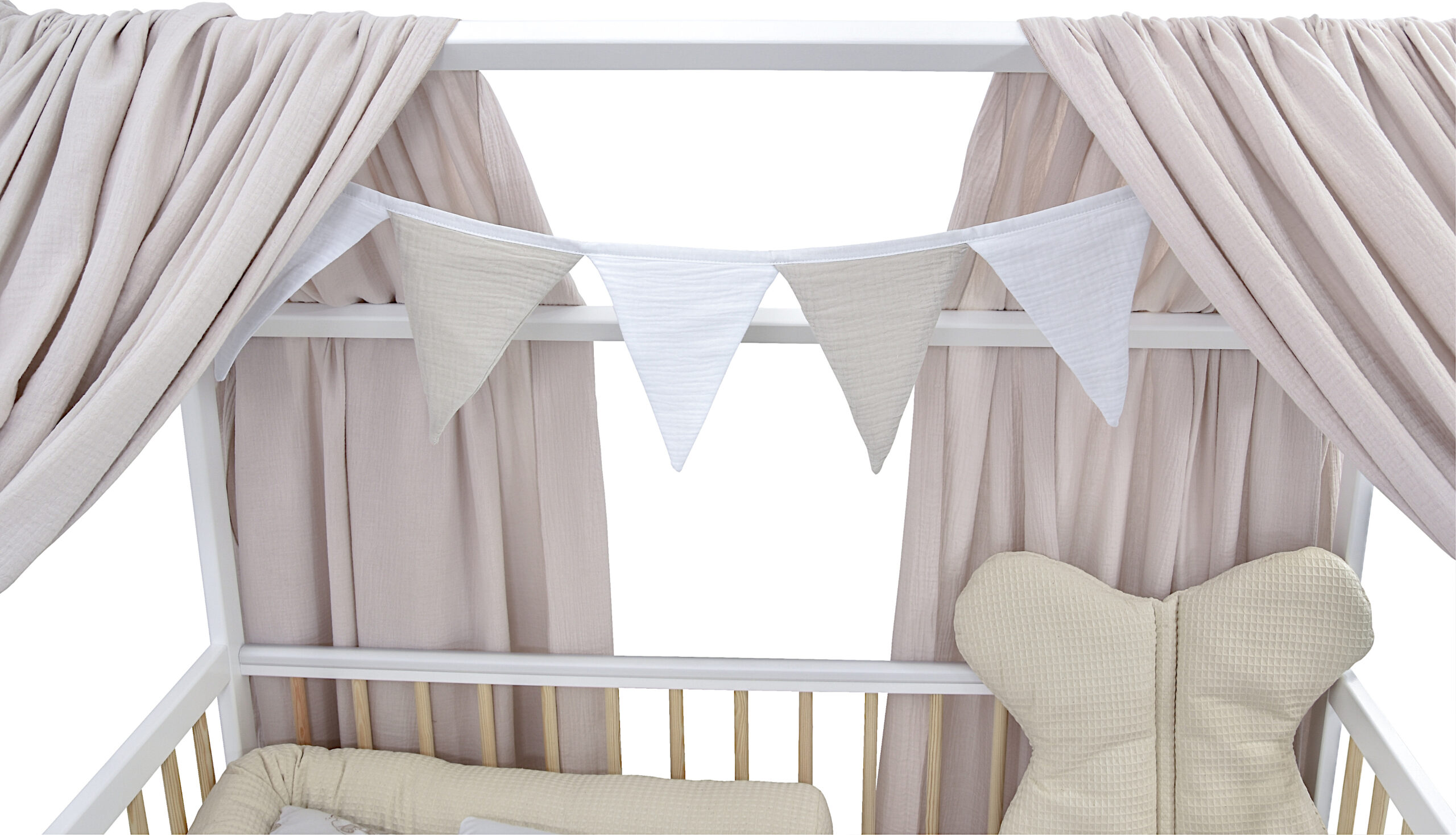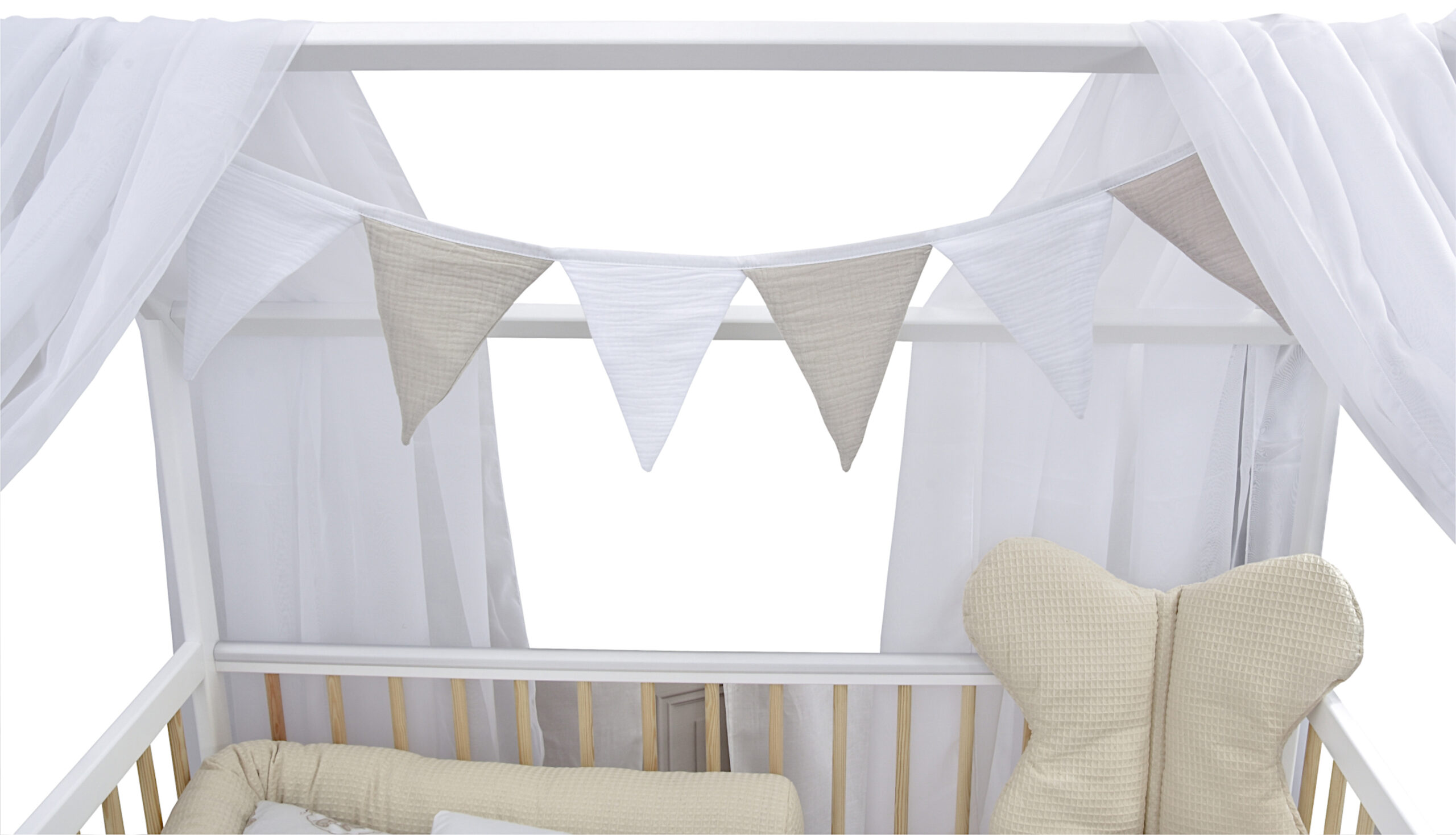 Die niedliche Girlande aus 8 Dreiecken rundet das Ambiente des Babyhausbettes perfekt ab.