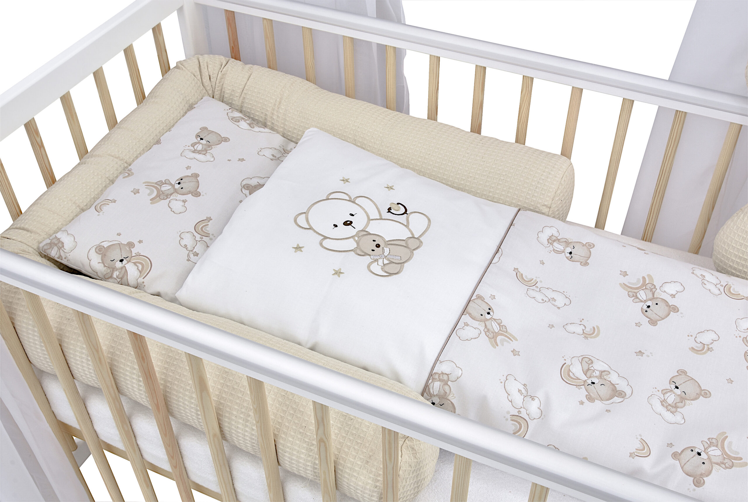 Komplettbett Babybett Hausbett 120×60 cm Weiß Kiefer dekoratives Bettwäsche Set Bärchen beige Waffelpique