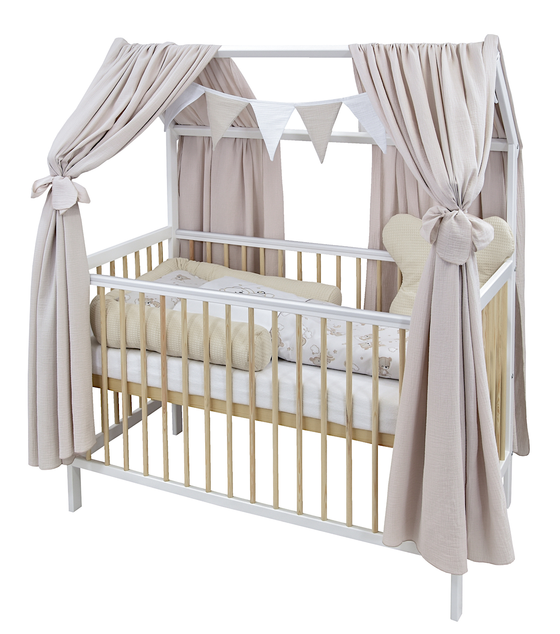 Entdecken Sie das ultimative 2in1 Babyhausbett, das Ihrem kleinen Liebling einen sicheren und gemütlichen Schlafplatz bietet – das Hausbett 60×120 cm in strahlendem Weiß und warmen Kiefer Ton mit einem tollen Bettwäsche Set Design.