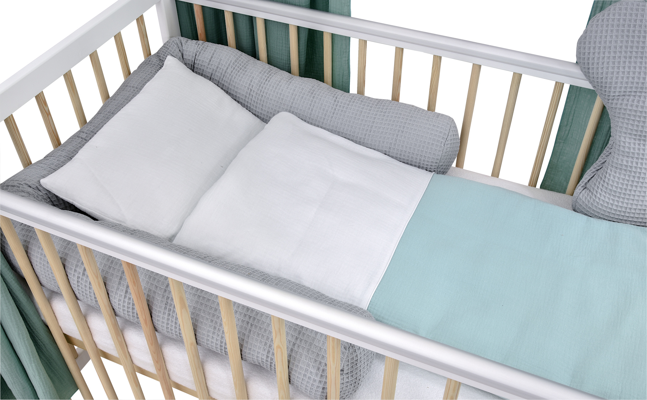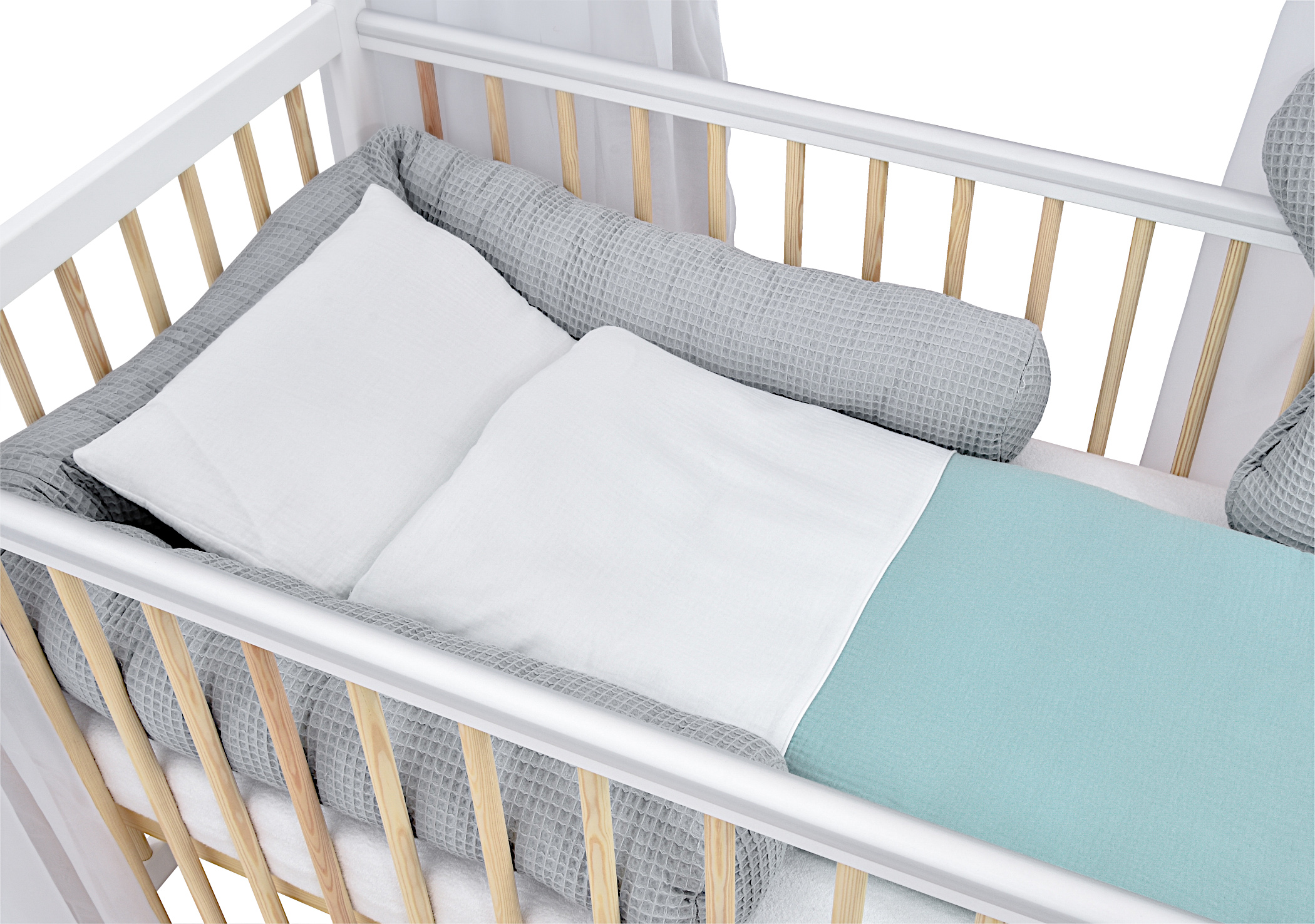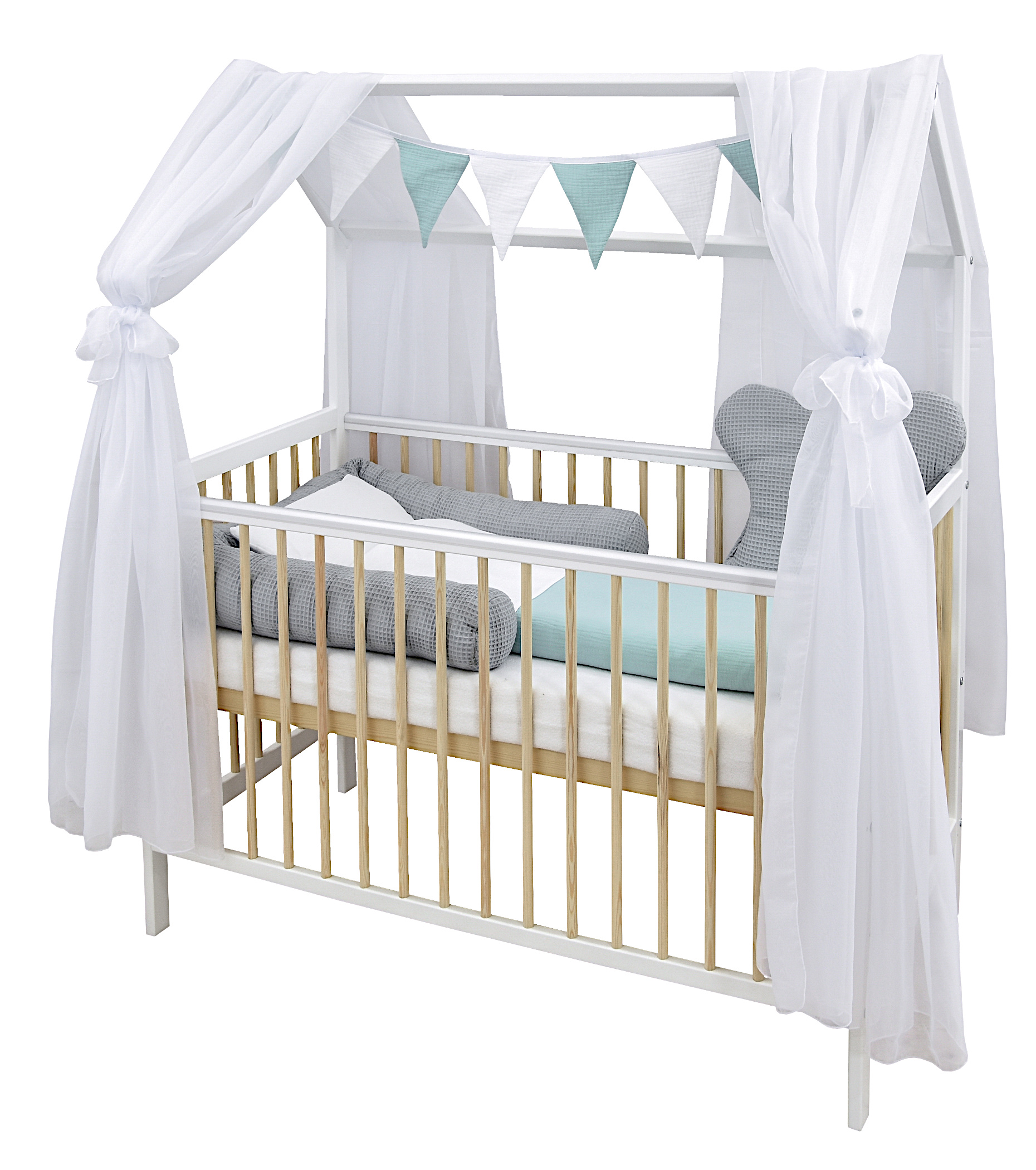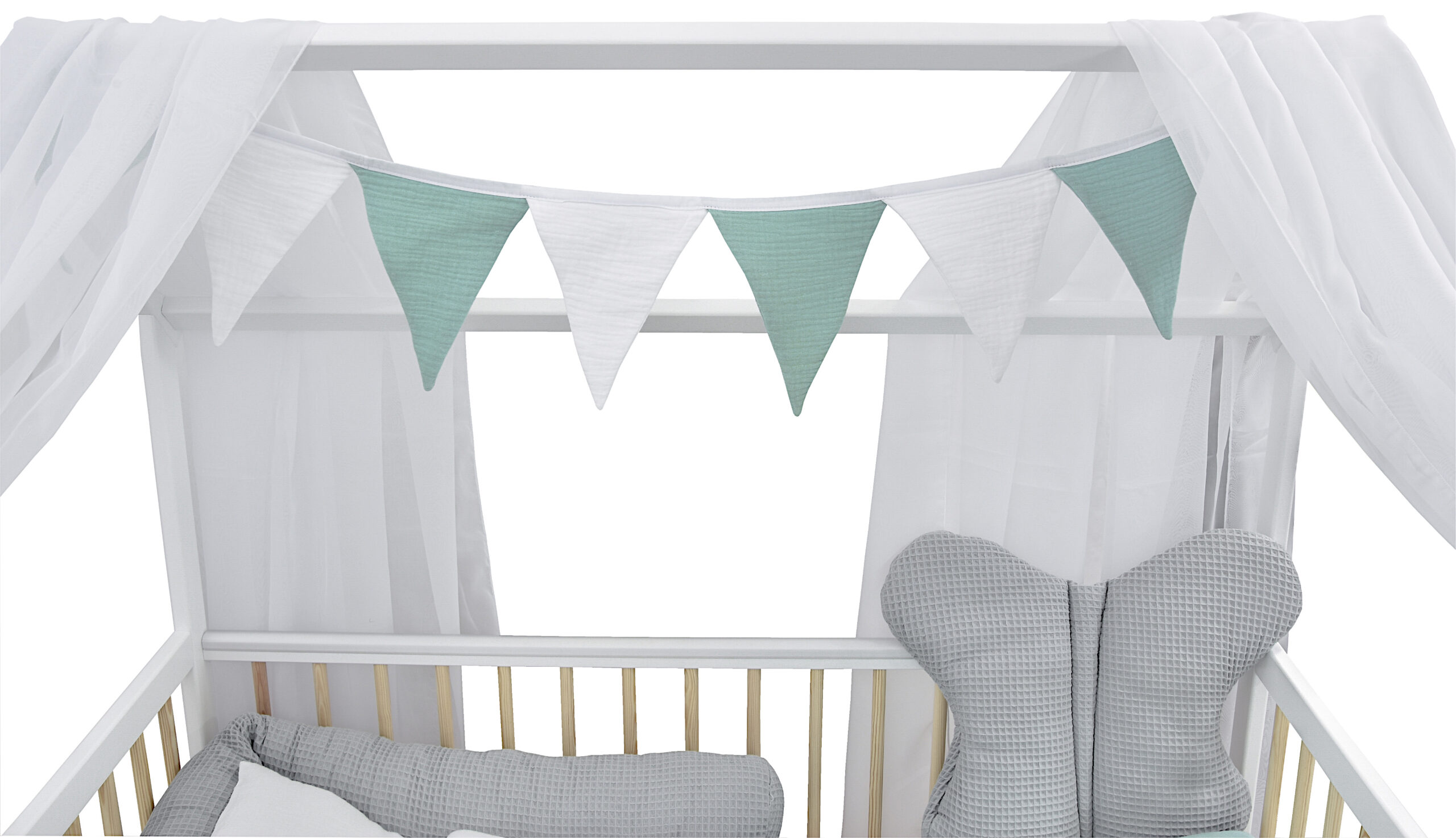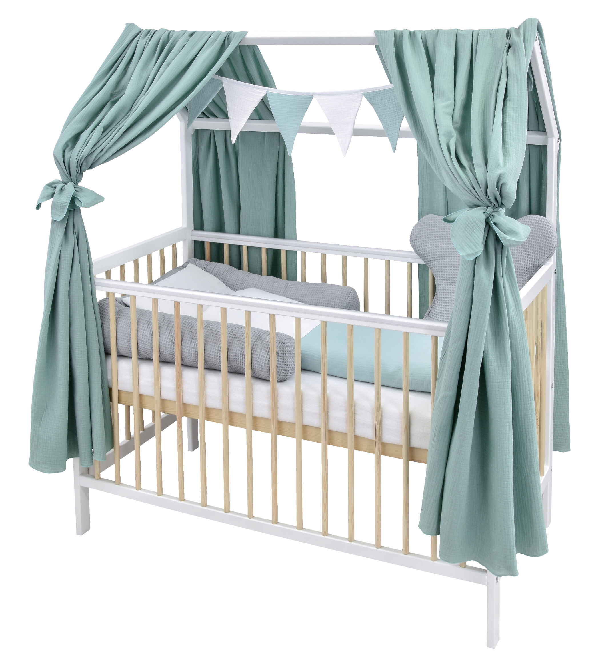 Komplettbett Babybett Hausbett 120×60 cm Weiß Kiefer dekoratives Bettwäsche Set Grau Mint Musselin Waffelpique