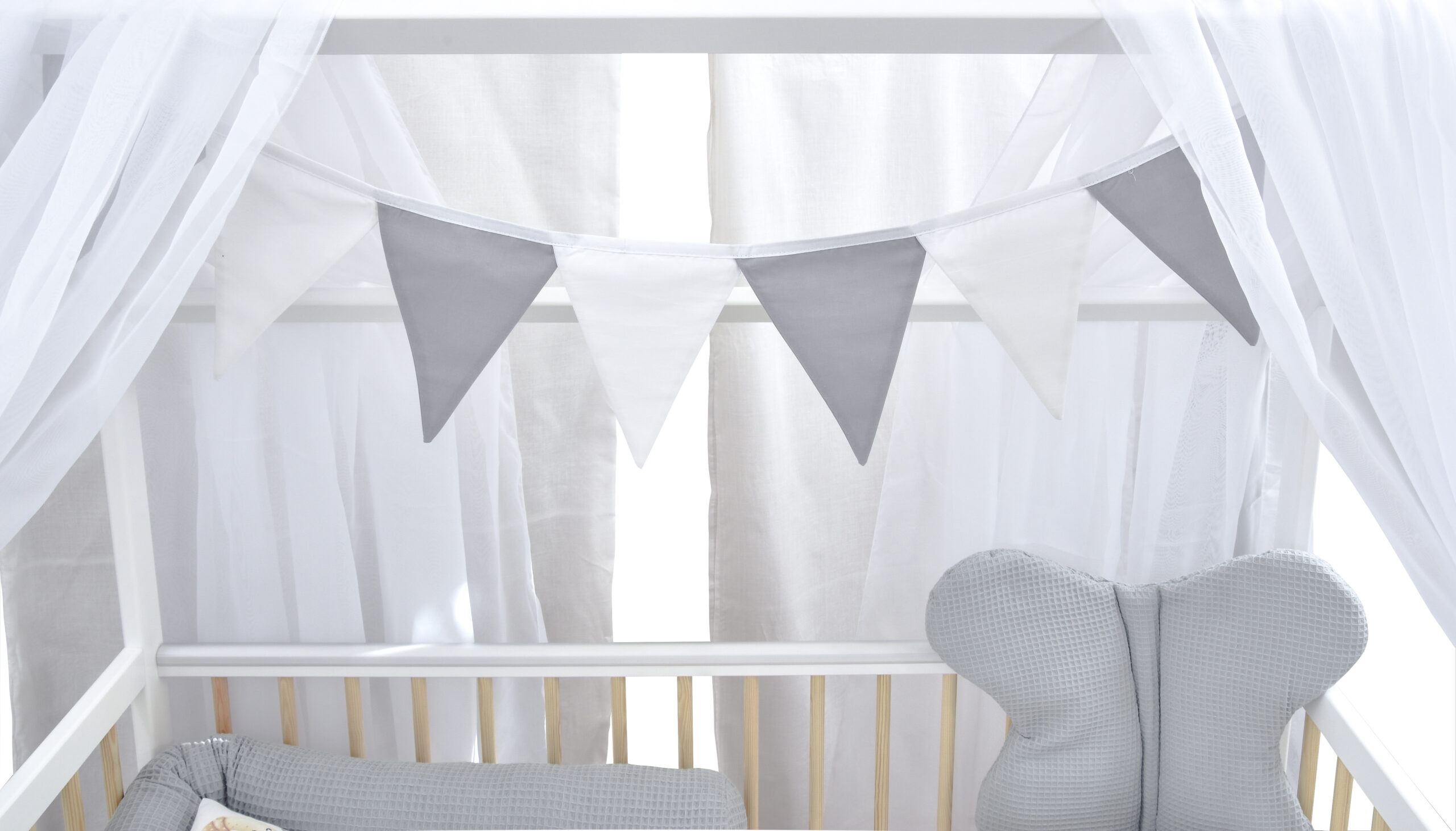 Die niedliche Girlande aus 8 Dreiecken rundet das Ambiente des Babyhausbettes perfekt ab.