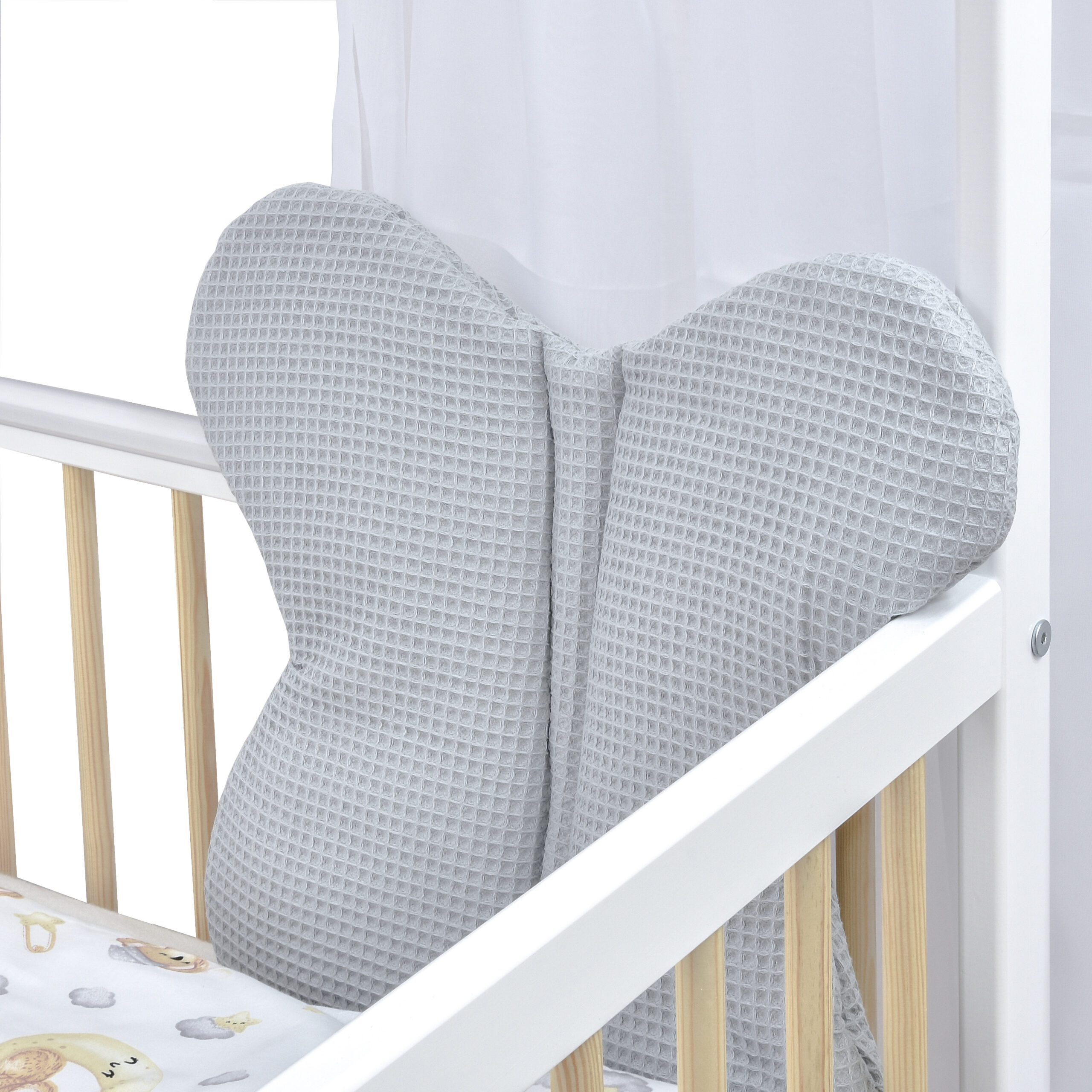 Das Bettset enthält auch einen Kissenbezug und Deckenbezug aus hochwertigem kuscheliger Baumwolle, sowie passendes Kissen und Decke. Für eine gemütliche Atmosphäre ist ein Schmetterlingskissen aus Waffelpique dabei, welches das Bett dekoriert.