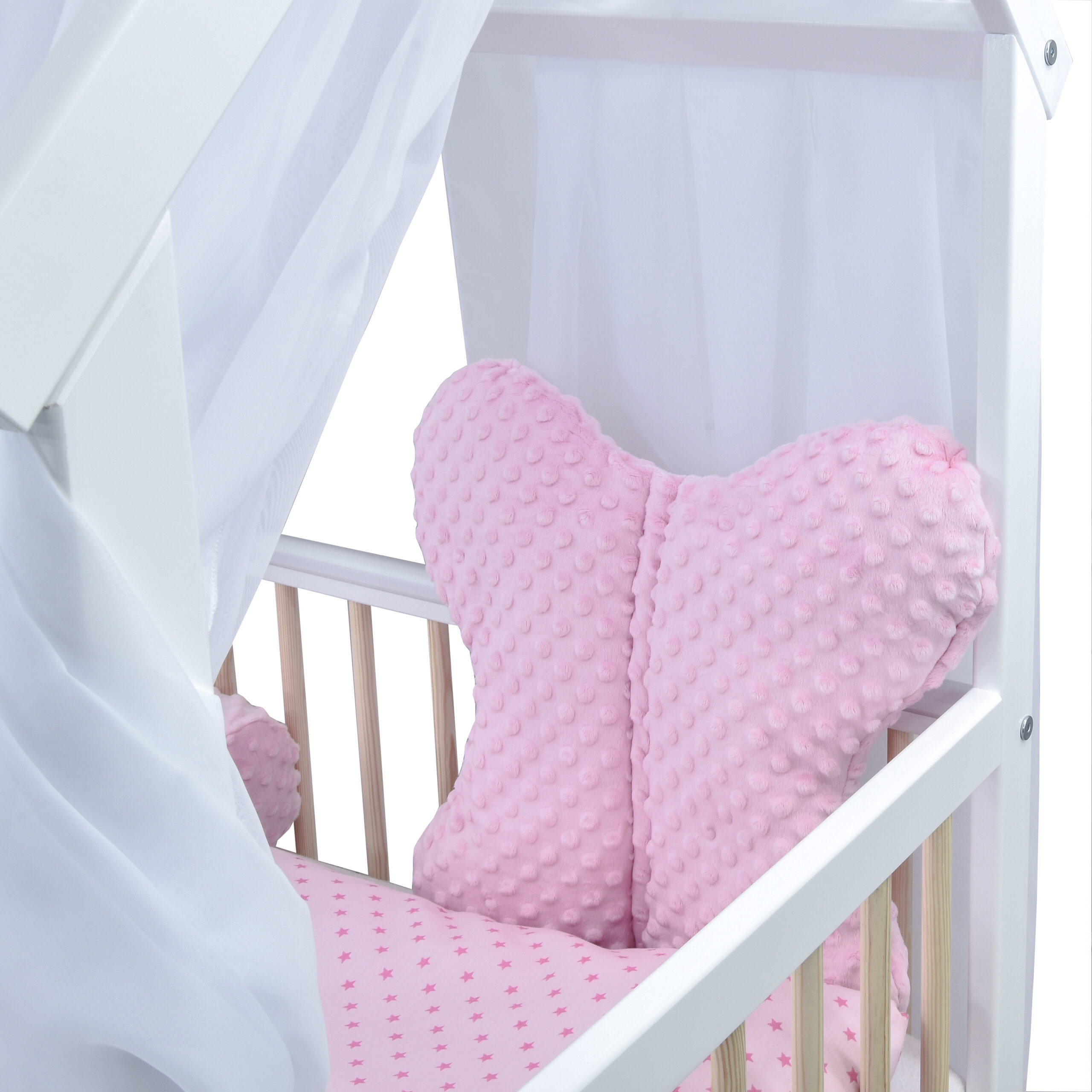 Das Bettset enthält auch einen Kissenbezug und Deckenbezug aus hochwertigem kuscheliger Baumwolle, sowie passendes Kissen und Decke. Für eine gemütliche Atmosphäre ist ein Schmetterlingskissen aus Minky dabei, welches das Bett dekoriert.