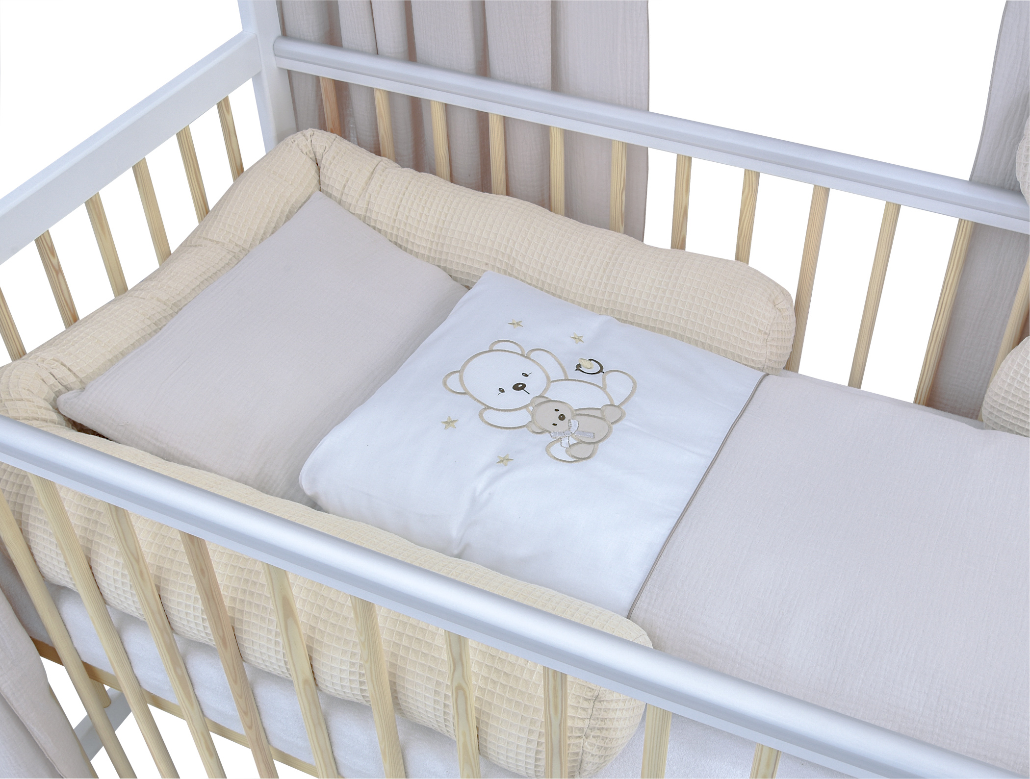 Komplettbett Babybett Hausbett 120×60 cm Weiß Kiefer dekoratives Bettwäsche Set Teddy beige Musselin