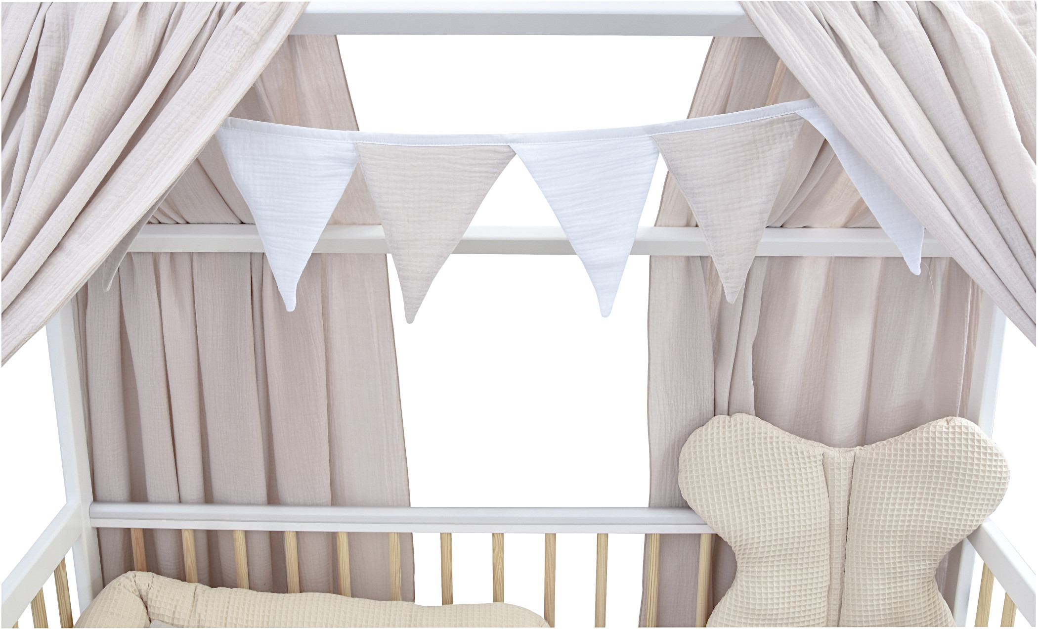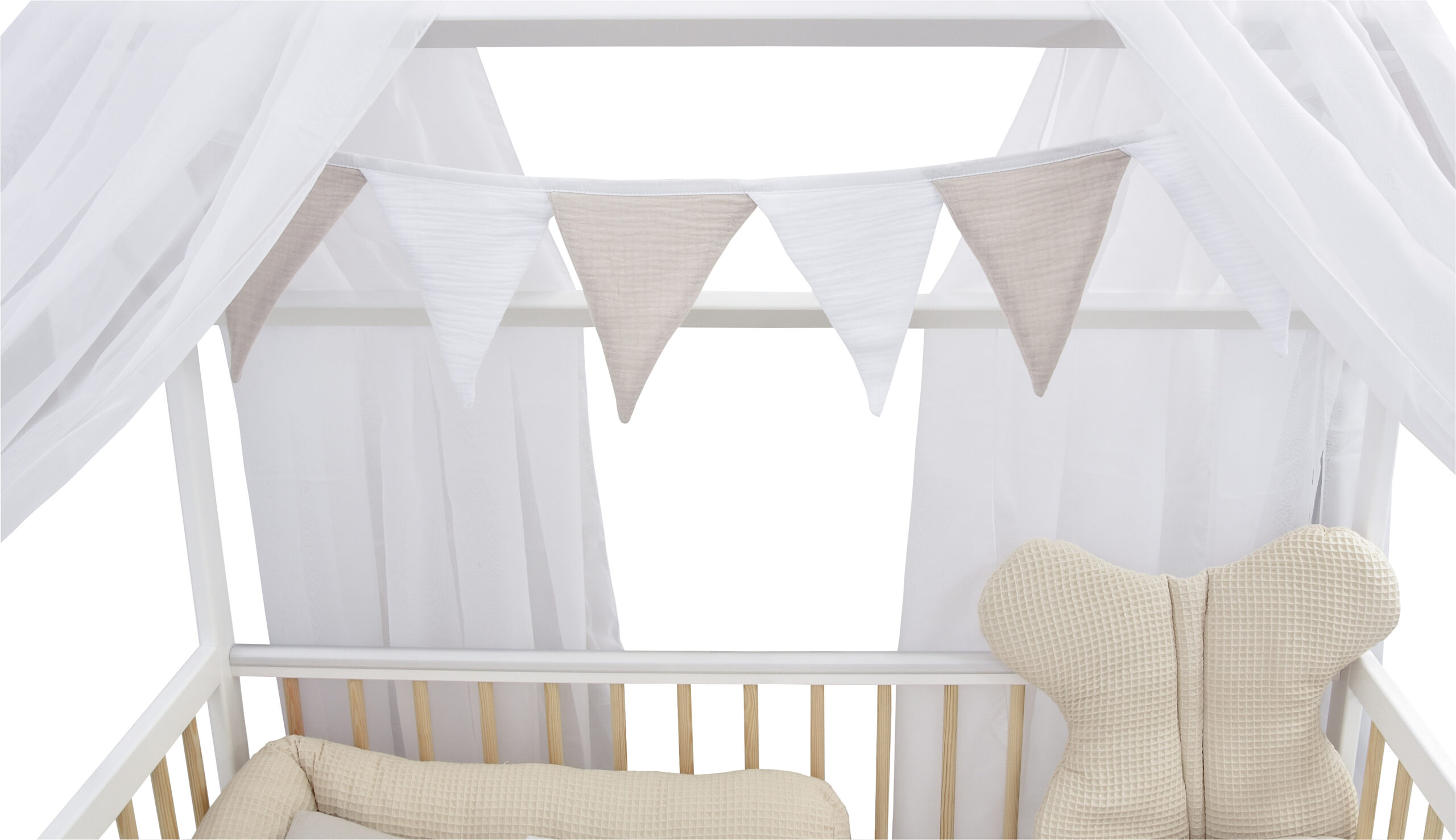 Die niedliche Girlande aus 8 Dreiecken rundet das Ambiente des Babyhausbettes perfekt ab.