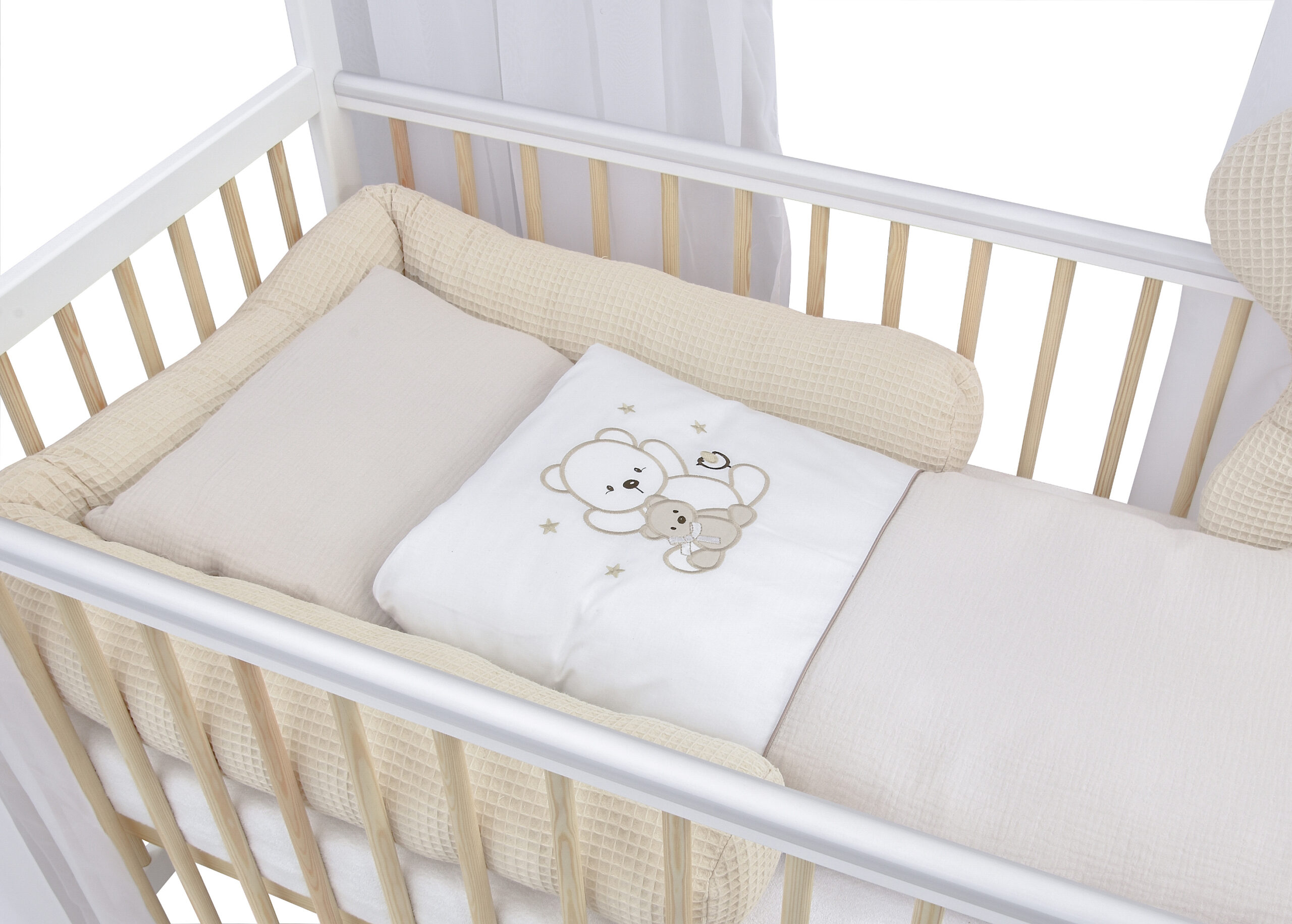 Besonders liebevoll gestaltet sind die Beißschienen, die nicht nur das empfindliche Zahnfleisch Ihres Babys schützen, sondern auch das Bett vor möglichen unschönen Abnutzungsspuren bewahren.