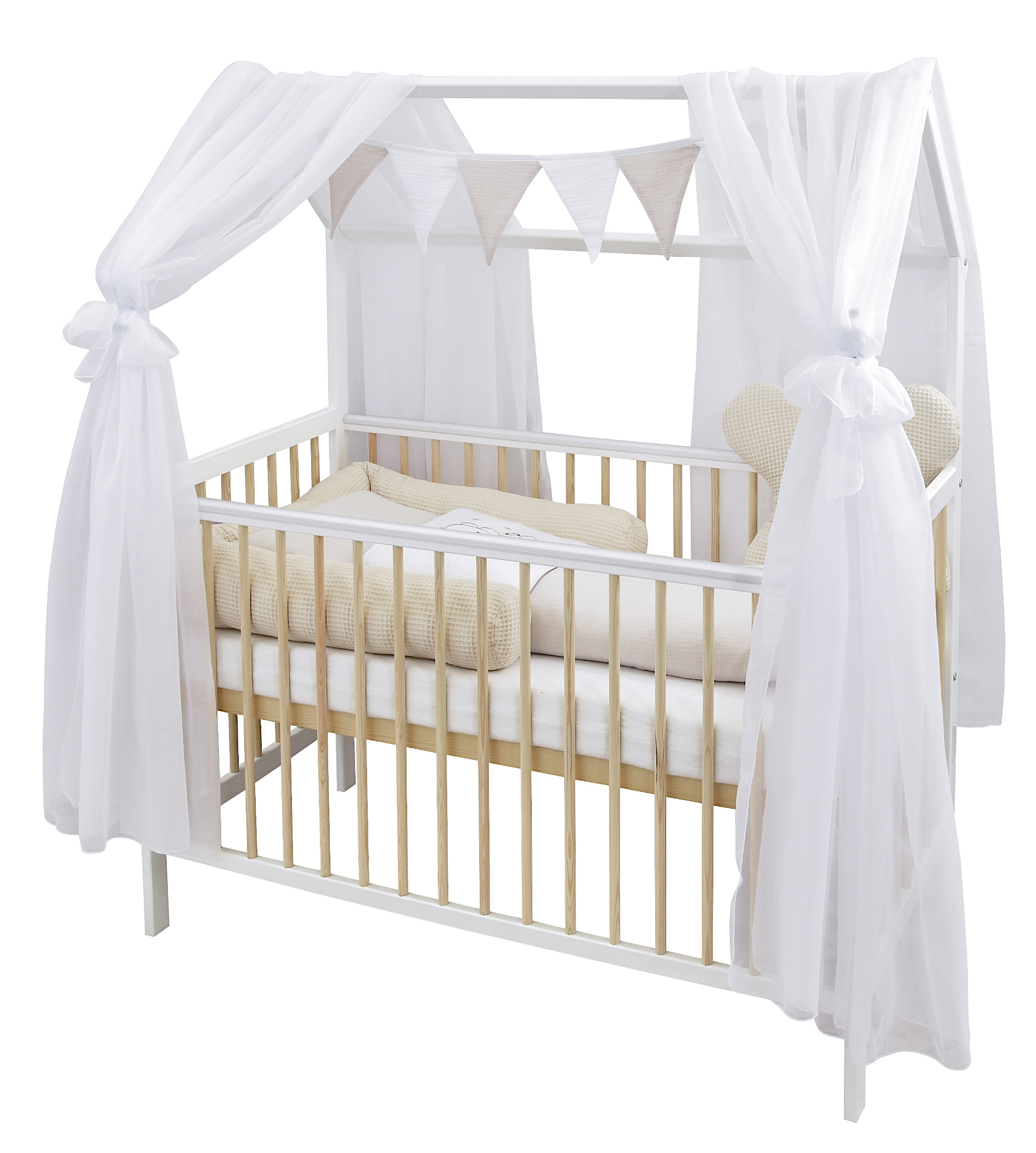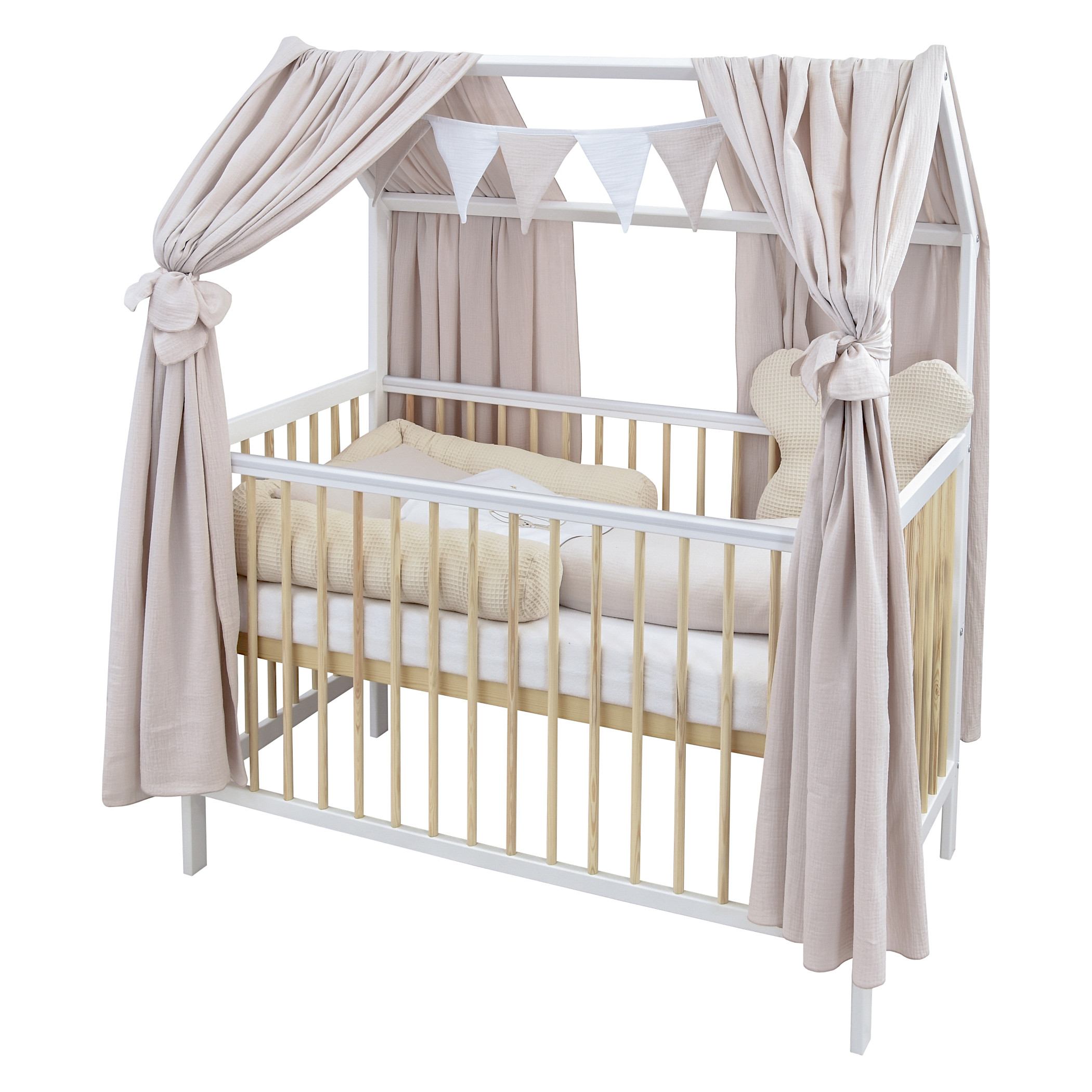 Entdecken Sie das ultimative 2in1 Babyhausbett, das Ihrem kleinen Liebling einen sicheren und gemütlichen Schlafplatz bietet – das Hausbett 60×120 cm in strahlendem Weiß und warmen Kiefer Ton mit einem tollen Bettwäsche Set Design.