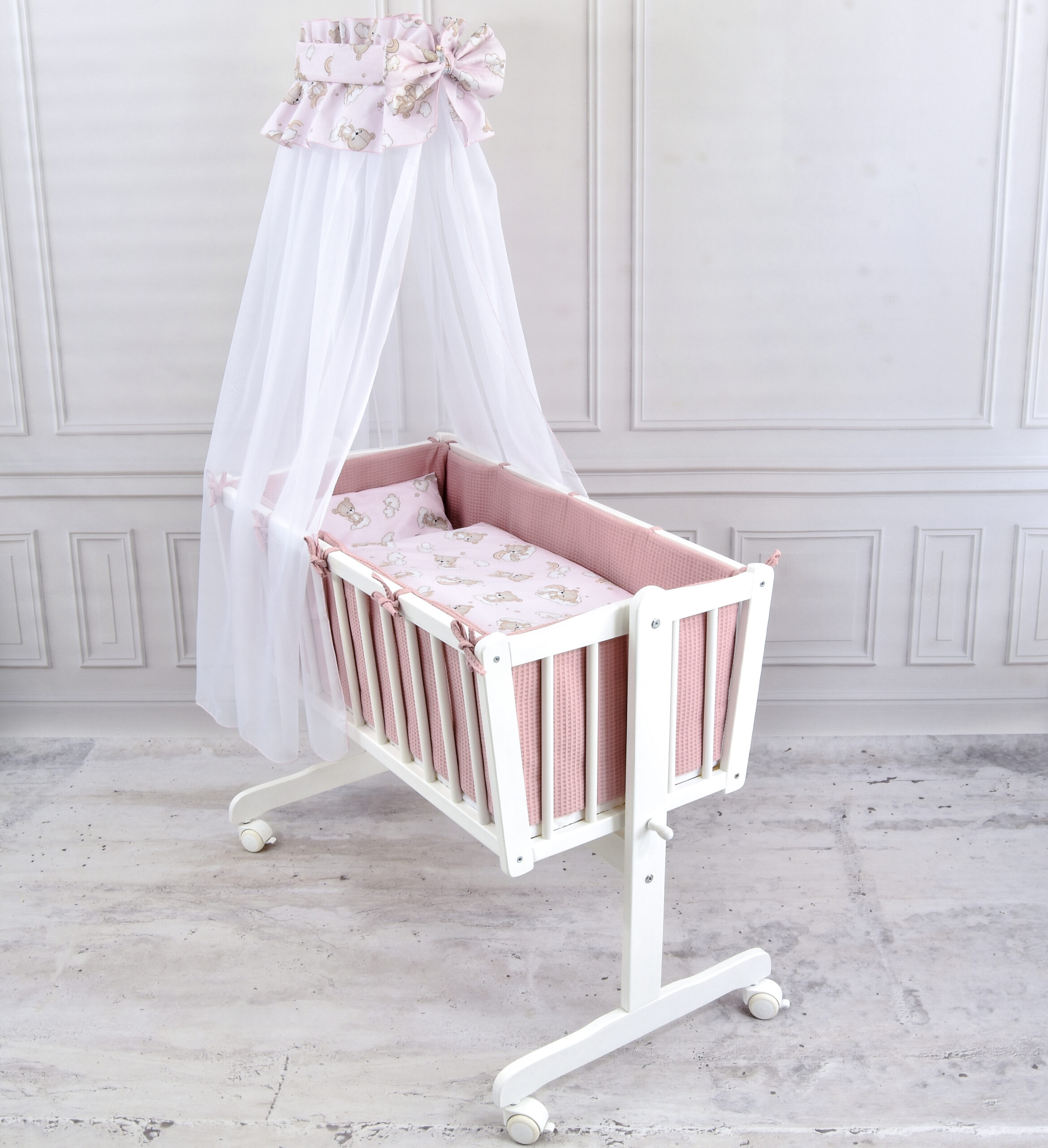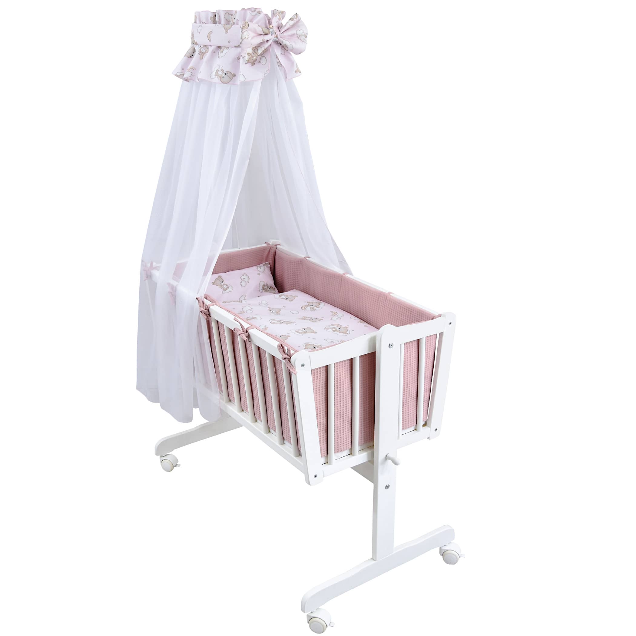 Komplettwiegenset weiß Bärchen rosa Waffelpique Schaukelwiege in weiß aus Kiefer Massivholz mit passendem Wiegen Set