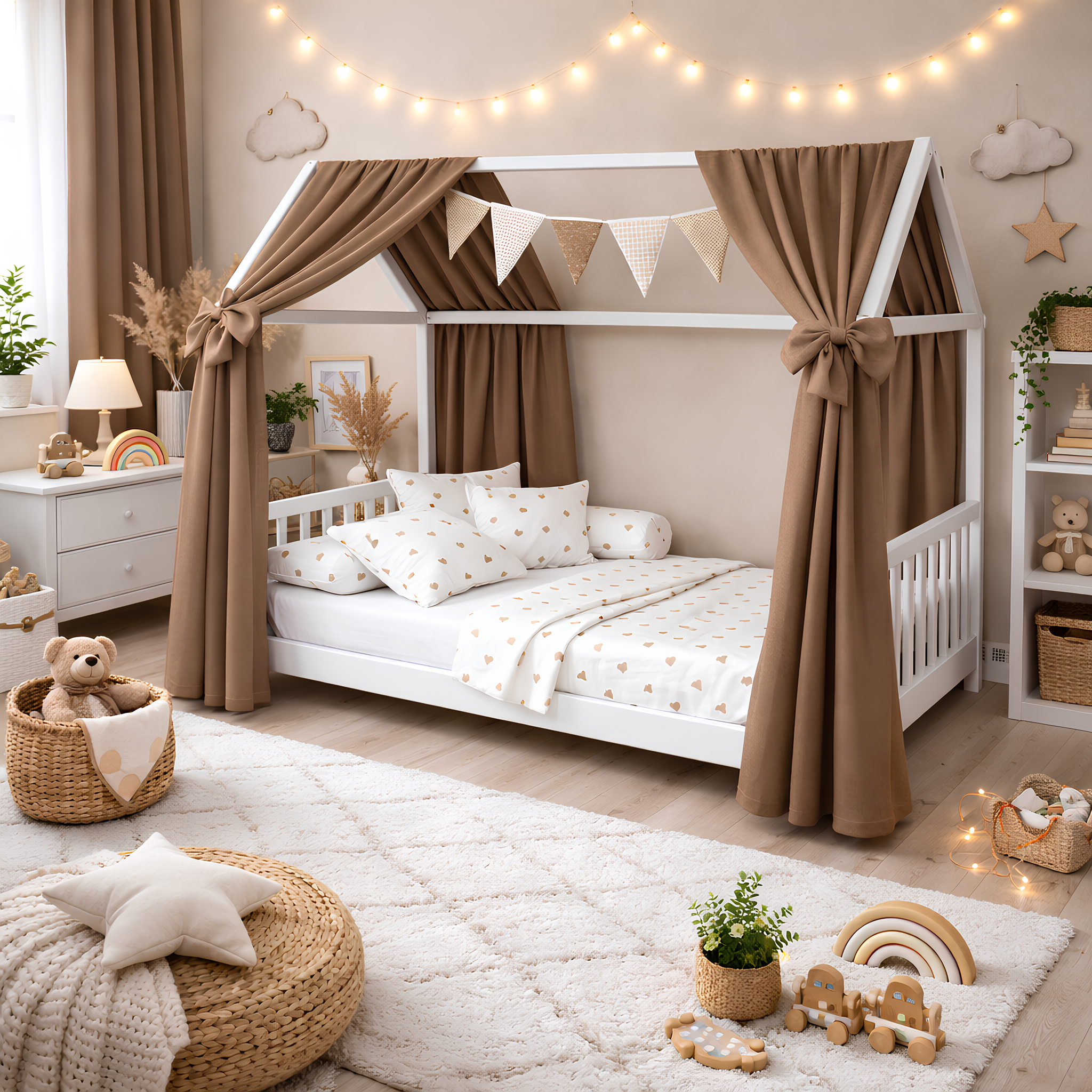 Dieser Betthimmel für Hausbett und Kinderbett wurde speziell für gängige Hausbett-Modelle entwickelt und eignet sich perfekt als Kombination aus funktionalem Sichtschutz und stilvoller Kinderzimmer Dekoration. Die natürliche Musselin-Struktur verleiht dem Himmel eine moderne, hochwertige Optik und macht ihn zu einem echten Blickfang im Babyzimmer.