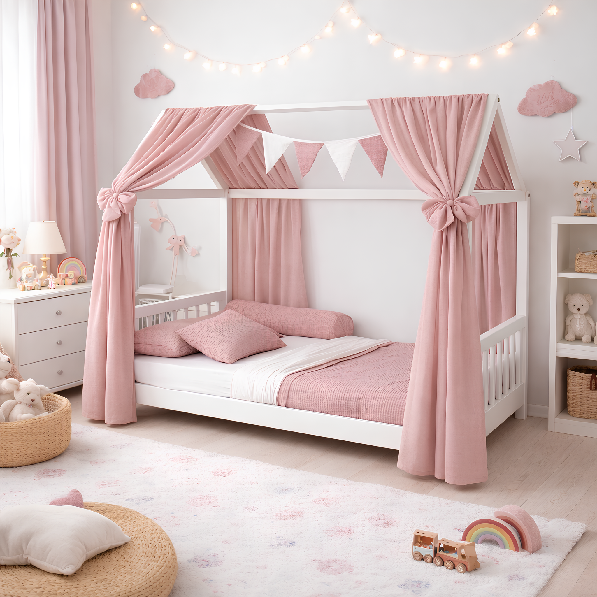 Unser hochwertiger Betthimmel für Baby Hausbetten aus Musselin verwandelt jedes Kinderbett in eine gemütliche Wohlfühloase. Der weiche, luftige Stoff aus 100 % Baumwolle Musselin ist besonders sanft zur empfindlichen Babyhaut und sorgt durch seine atmungsaktive Struktur für ein angenehmes Schlafklima – ideal für jede Jahreszeit.